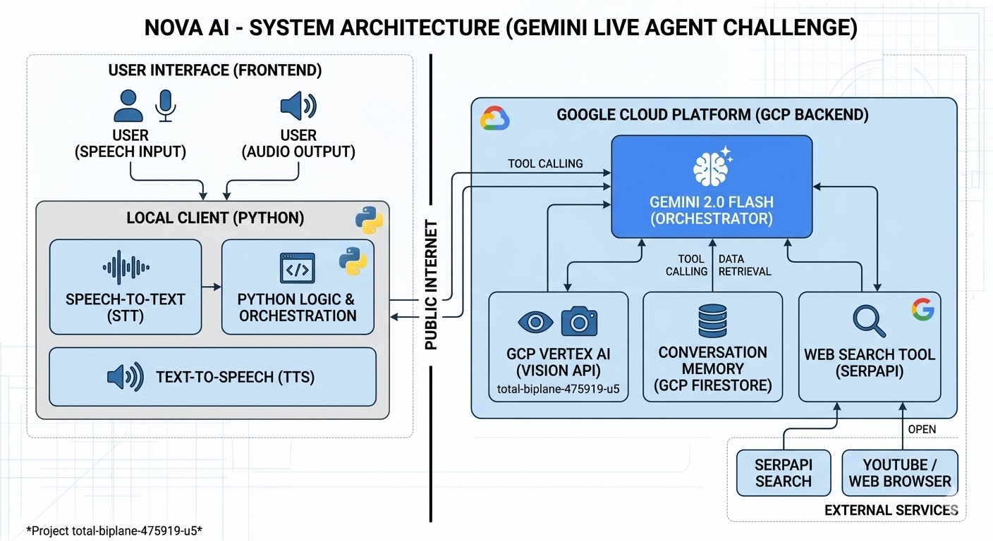 Accomplishments that we're proud of We are incredibly proud of achieving Real-time Web Grounding. Seeing Nova AI successfully fetch current news and explain it with a human-like voice while running on a Google Cloud backend was a massive milestone for us. We also successfully implemented a modular architecture that makes the agent highly scalable.