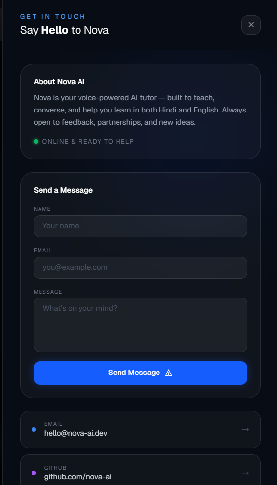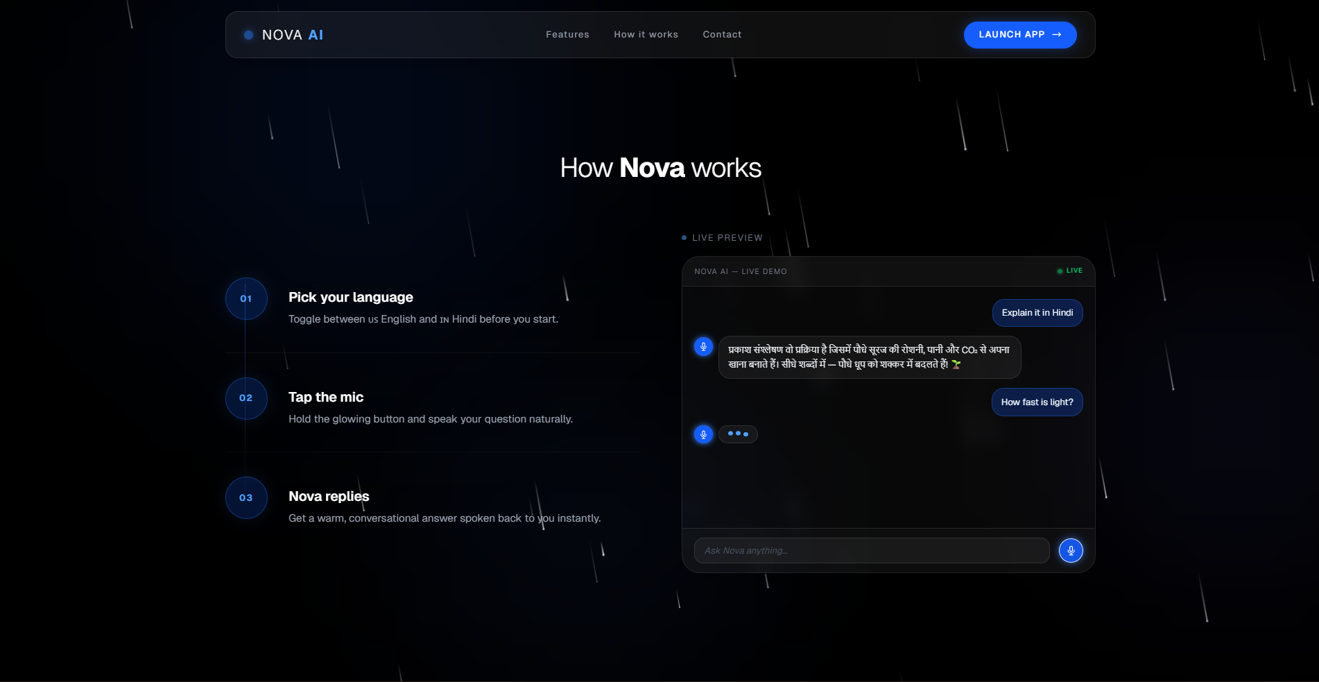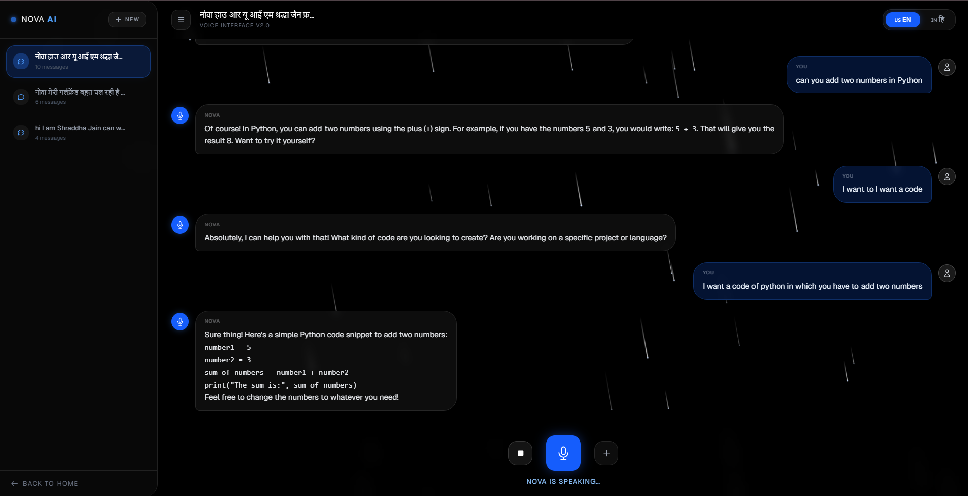 What it does Nova AI lets students ask questions by voice in Hindi or English and get clear, conversational answers spoken back in the same language. It keeps a full chat history sidebar so students can revisit topics anytime.