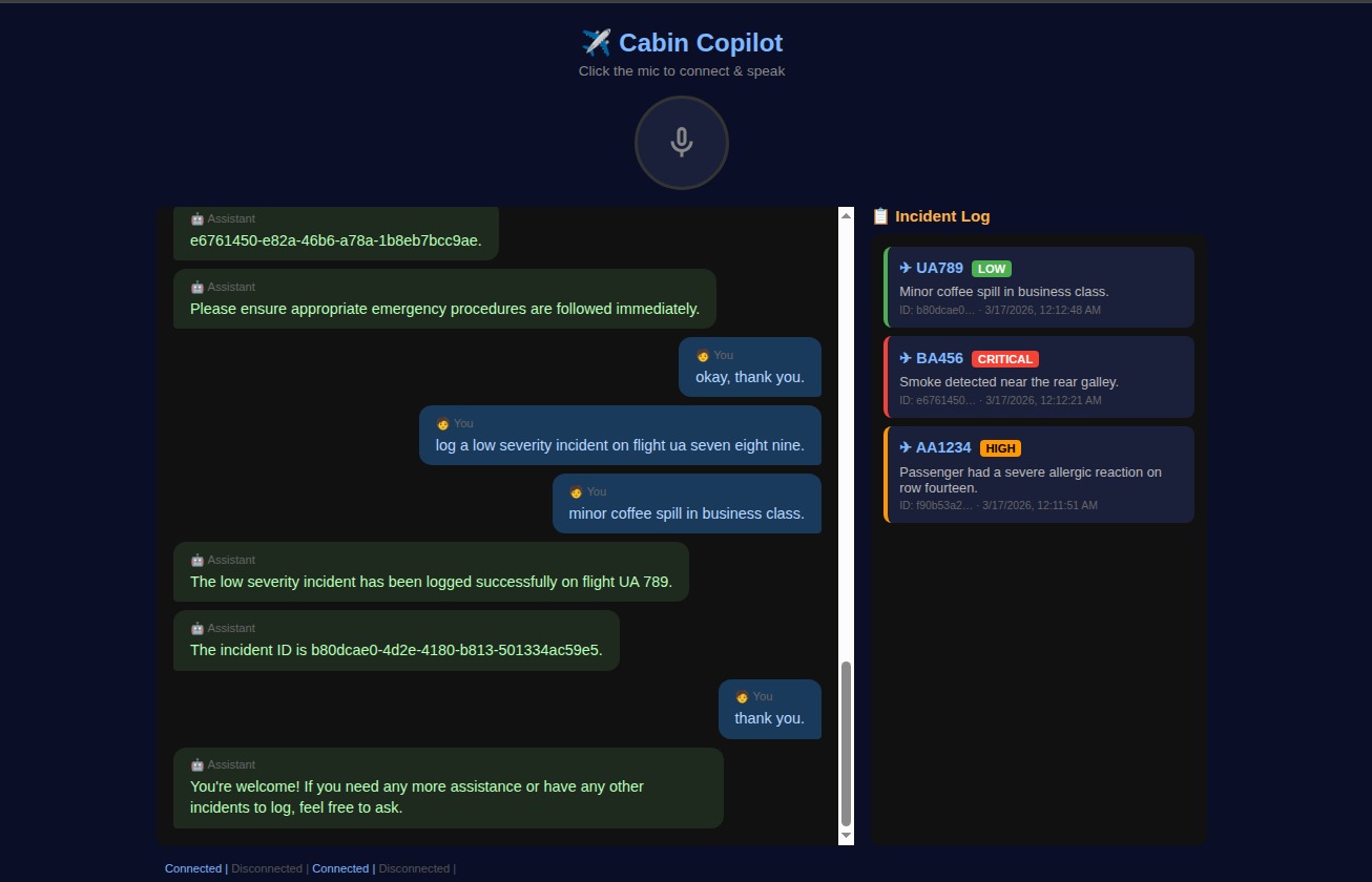 - Log incidents hands-free → "Log a high severity incident on flight AA1234 , passenger had an allergic reaction" → The incident is validated, timestamped, and written to the database by voice. Done.