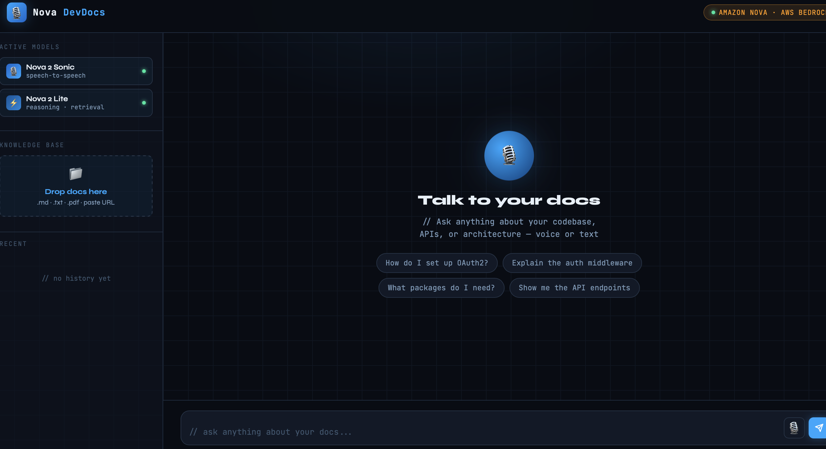 Nova DevDocs is a real-time voice assistant for developers. You press a mic button, ask your question out loud — "How do I set up OAuth2 in my Node.js app?" — and Nova answers you in speech, instantly, pulling the answer directly from your team's own documentation. It supports any knowledge base: GitHub READMEs, Notion pages, Confluence exports, PDFs, or plain text files.