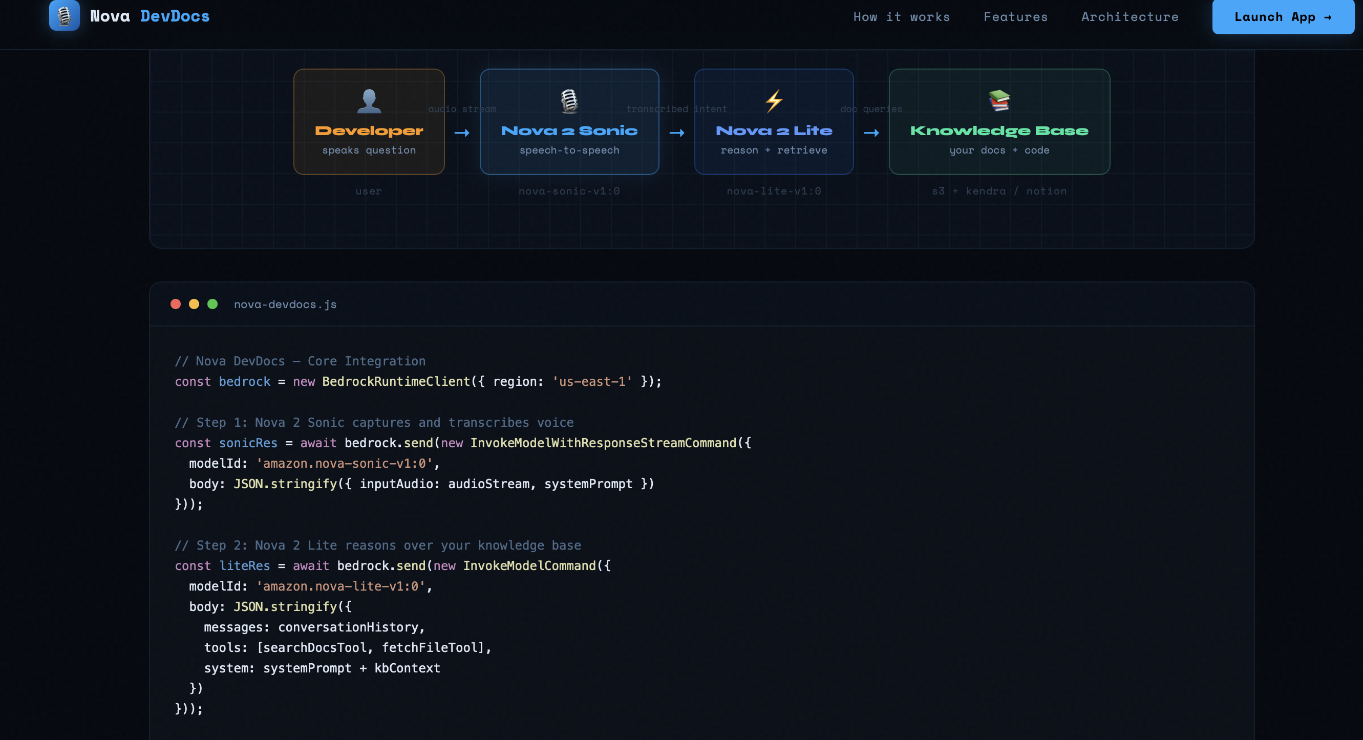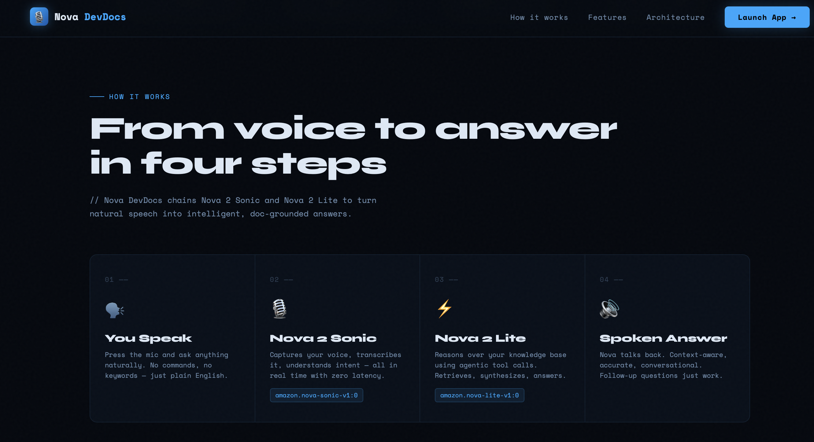 We built a four-layer architecture entirely on AWS Bedrock. Amazon Nova 2 Sonic sits at the voice layer — capturing audio input, understanding intent in real time, and synthesizing the spoken response back to the developer. Amazon Nova 2 Lite powers the agentic reasoning layer — it runs a tool-use loop, calling our search tool multiple times if needed, retrieving relevant document chunks, and synthesizing a precise answer before handing it back to Sonic .