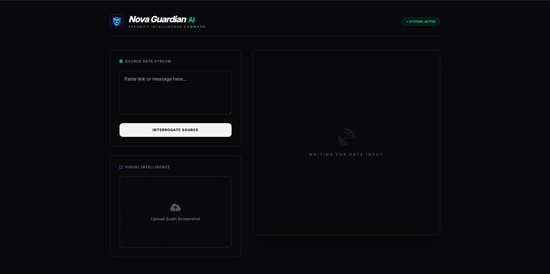 Nova Guardian AI is an AI-powered cybersecurity assistant that detects scam messages and phishing attempts. Users can paste suspicious text messages or upload screenshots of conversations or websites. The system analyzes the content and generates a risk score indicating whether the message is safe, suspicious, or potentially malicious.