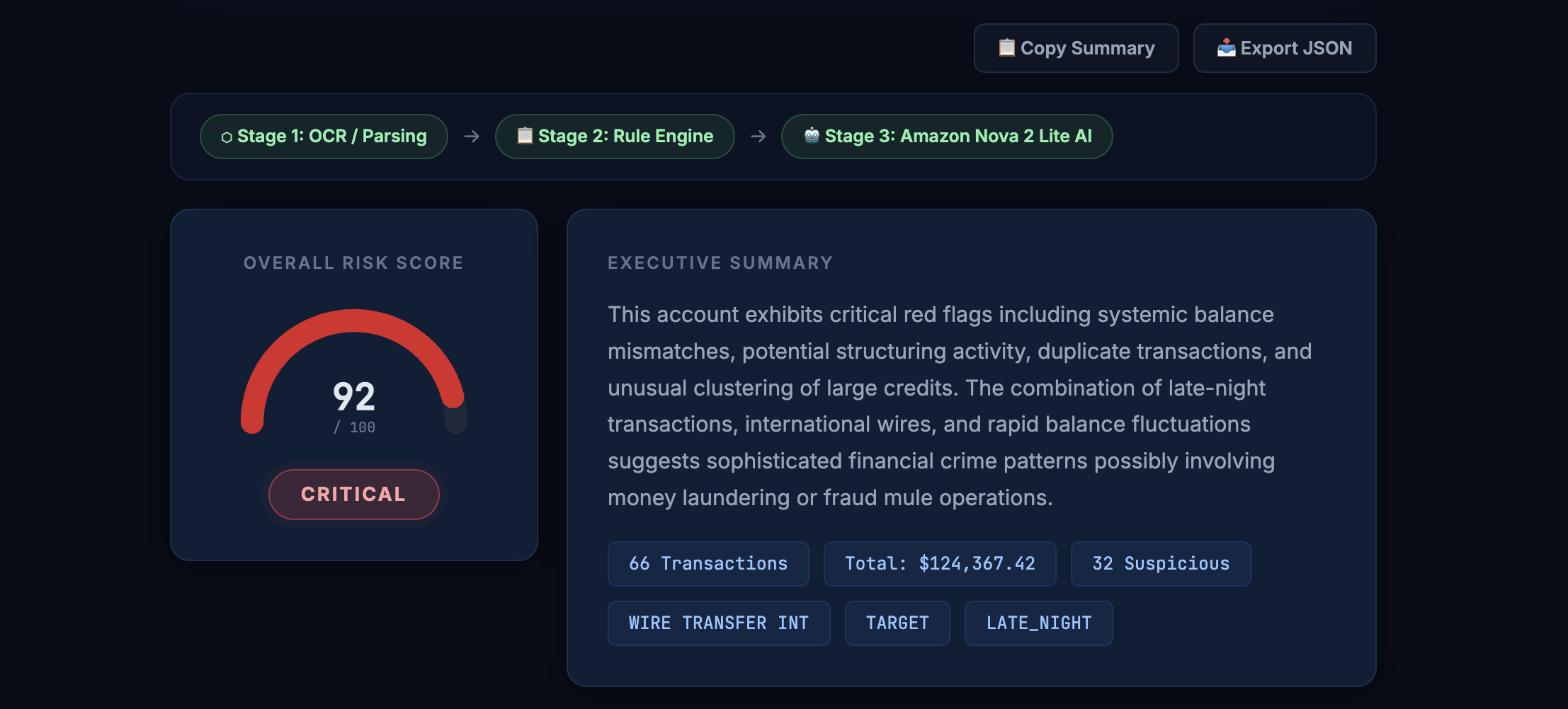 Financial compliance is currently a battle of manual labor versus high-speed digital crime. We saw compliance officers spending hundreds of hours manually squinting at low-quality bank statement scans and complex spreadsheets to find "needles in haystacks" like money laundering or structuring. We were inspired to build a solution that doesn't just process data, but understands the financial narrative. By combining the deterministic precision of rules with the reasoning power of Amazon Nova 2 Lite, we wanted to democratize elite-level financial oversight for small and mid-sized institutions.