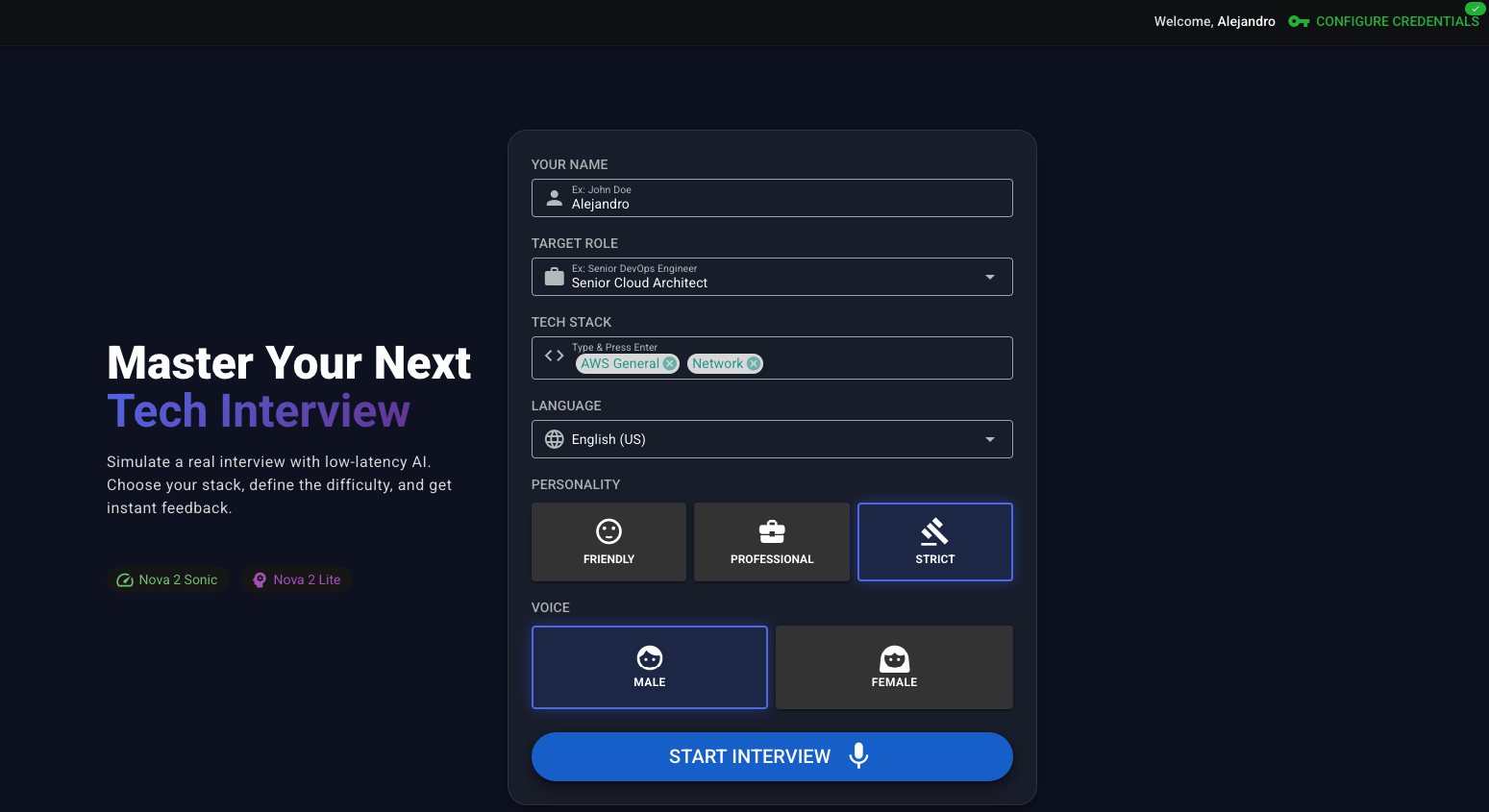 Traditional mock interviews cost are pretty expensive per session, require scheduling weeks in advance, and provide subjective feedback. When Amazon Nova 2 Sonic launched with speech-to-speech capabilities, I realized we could democratize technical interview preparation—making high-quality practice accessible to anyone, anywhere, in many language, 24/7.