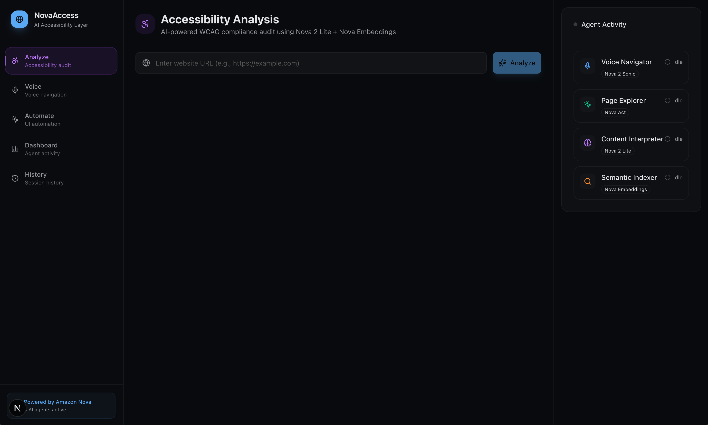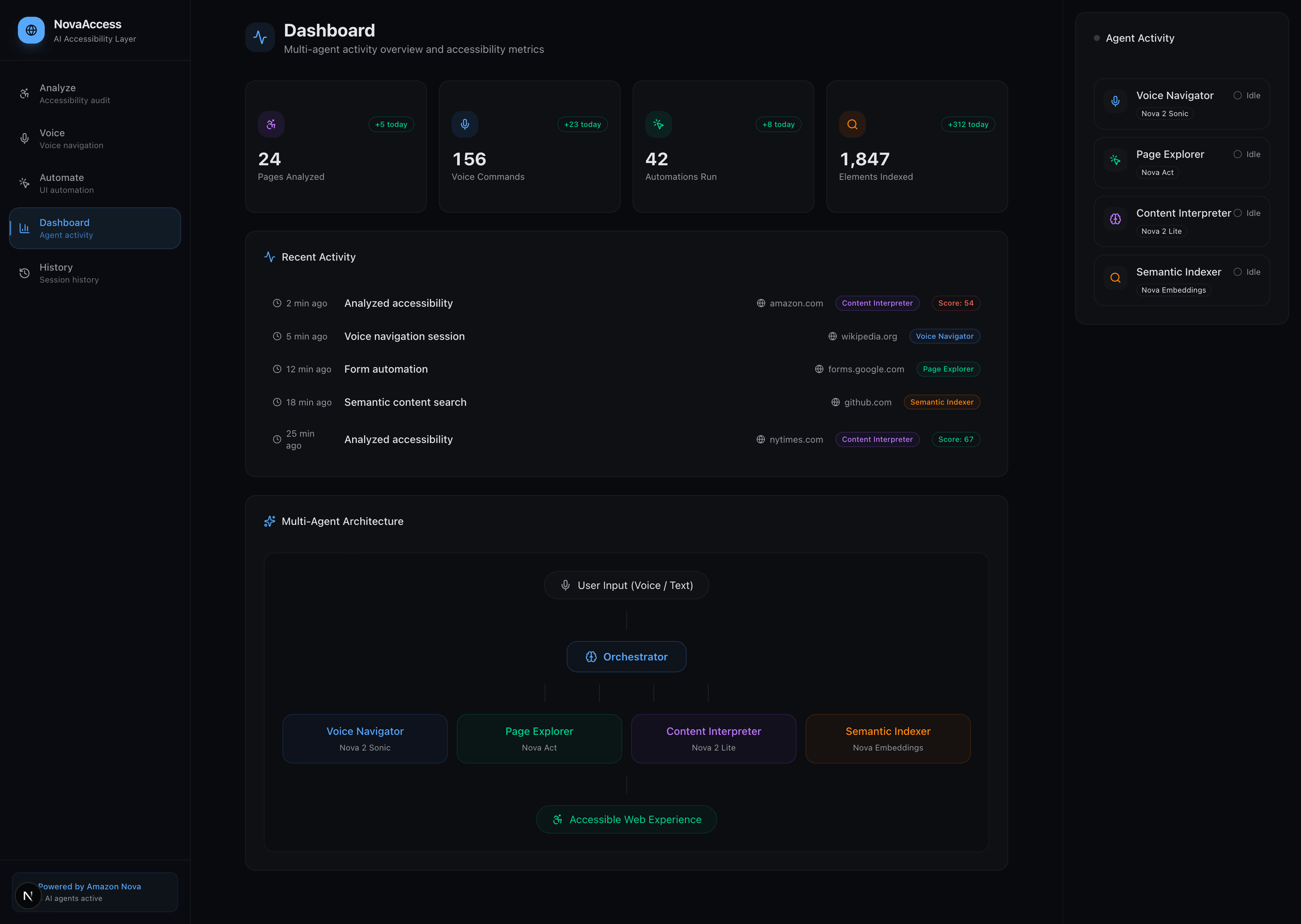 | Content Interpreter | Nova 2 Lite | Runs WCAG compliance audits, generates alt-text for images, describes page layouts, and simplifies complex content for cognitive accessibility |