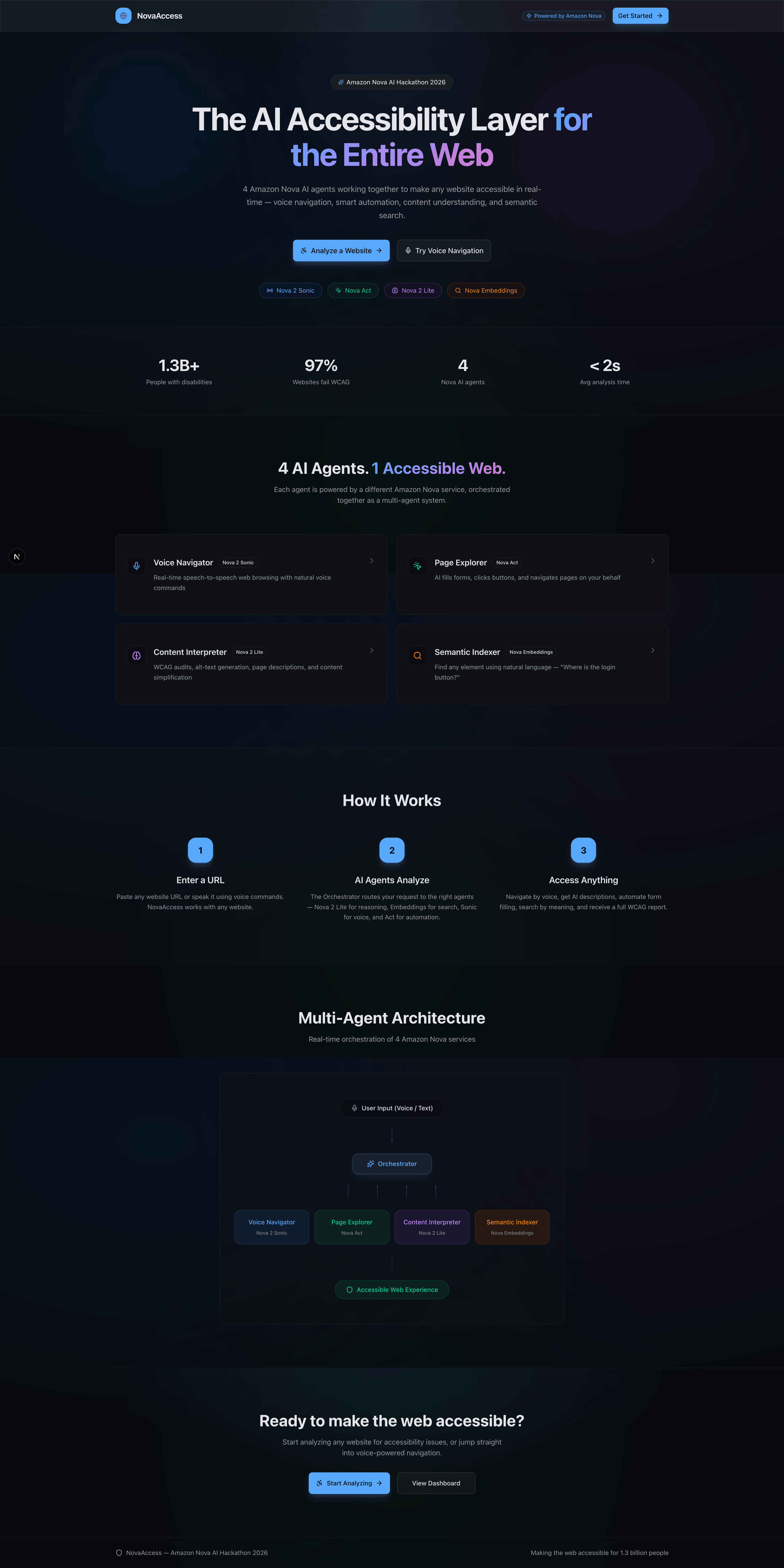 Amazon Nova gave us the tools to answer that question. Four distinct AI services, each solving a different dimension of web accessibility, coordinated by a single orchestrator. That's NovaAccess.