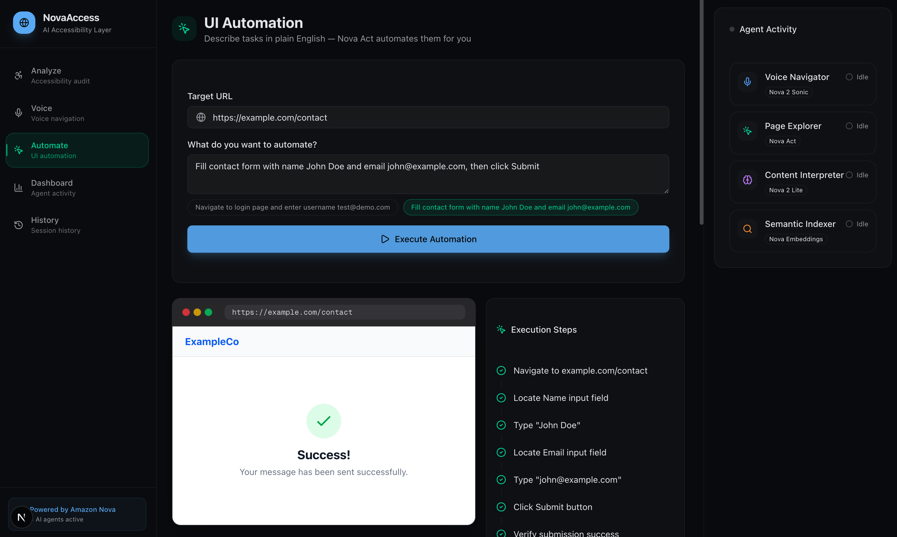 - AI-Powered Automation: Nova Act fills forms and clicks buttons for users who can't use a mouse, with a visual mock browser showing each step as it happens