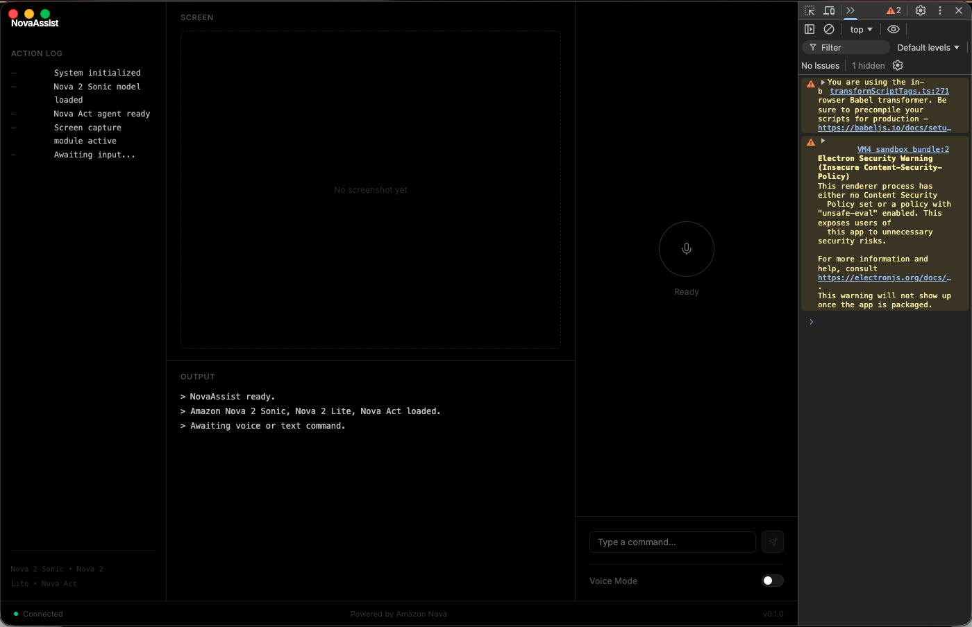 Seeing and acting: The screen agent loops through screenshot => Accessibility API element detection => Set-of-Mark annotation => Nova 2 Lite vision analysis => action execution => verify. For browser tasks, we also use Nova Act for complex multi-step workflows and direct AppleScript for simple Chrome control.