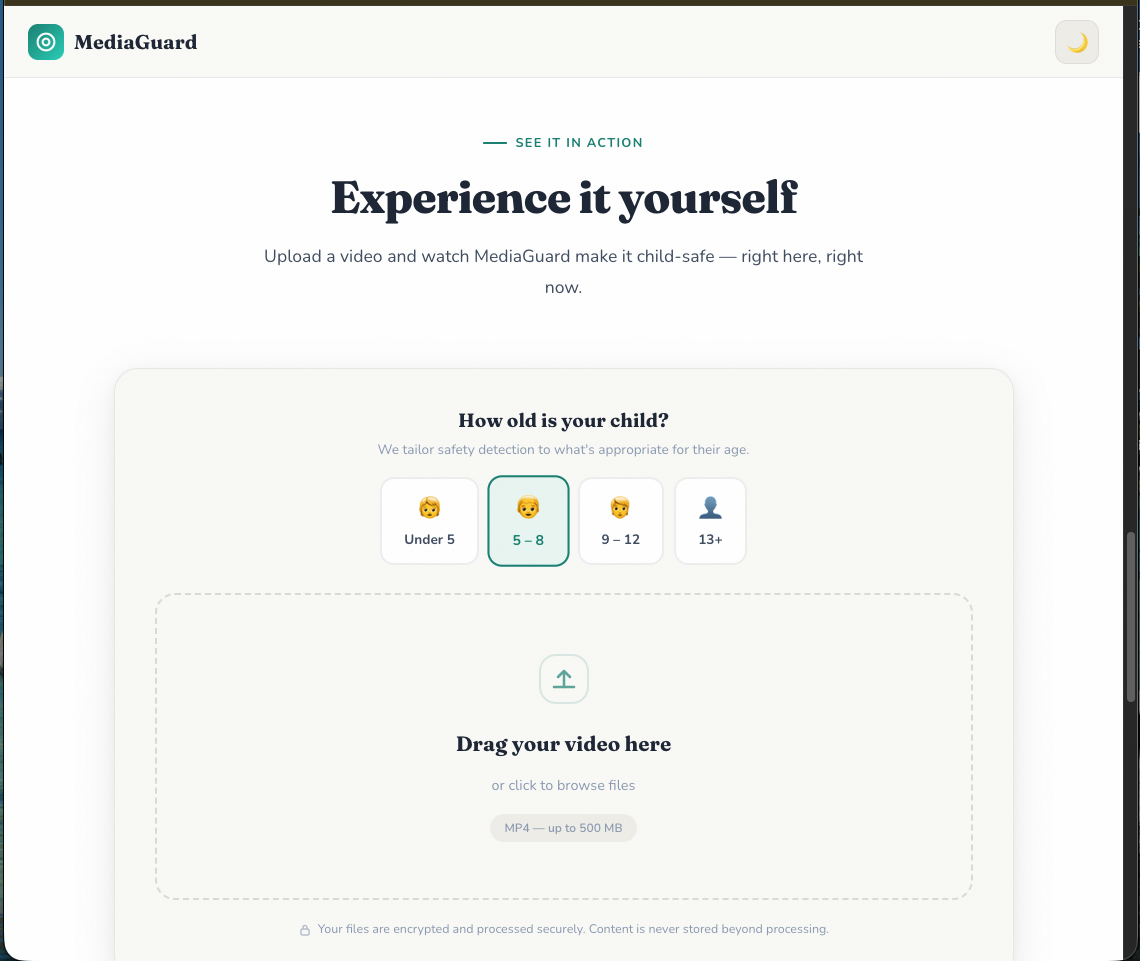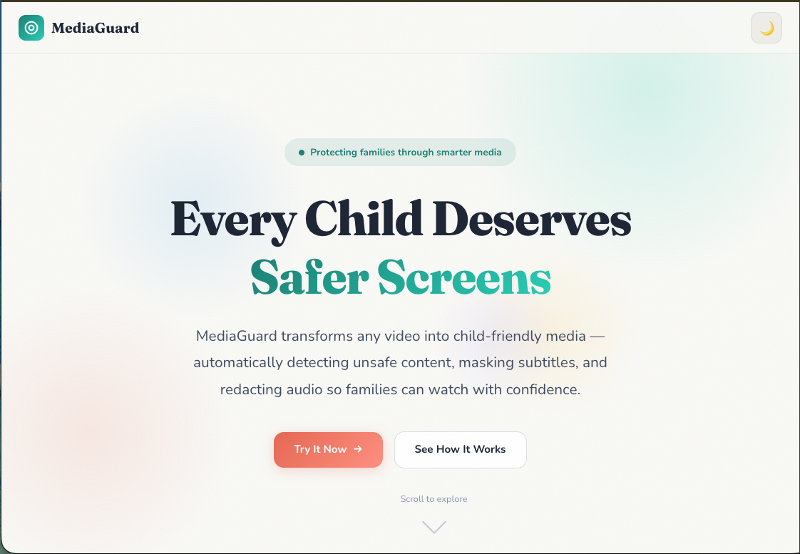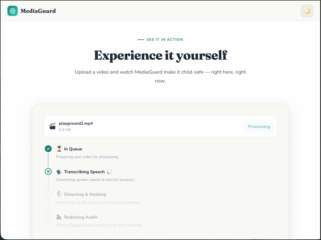 MediaGuard transforms uploaded videos into safer versions for children by automatically detecting and filtering age-inappropriate language.