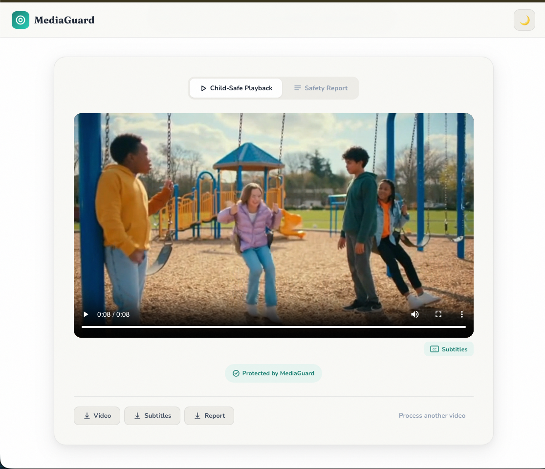 - MediaGuard produces a safer video, sanitized subtitles, and a safety report