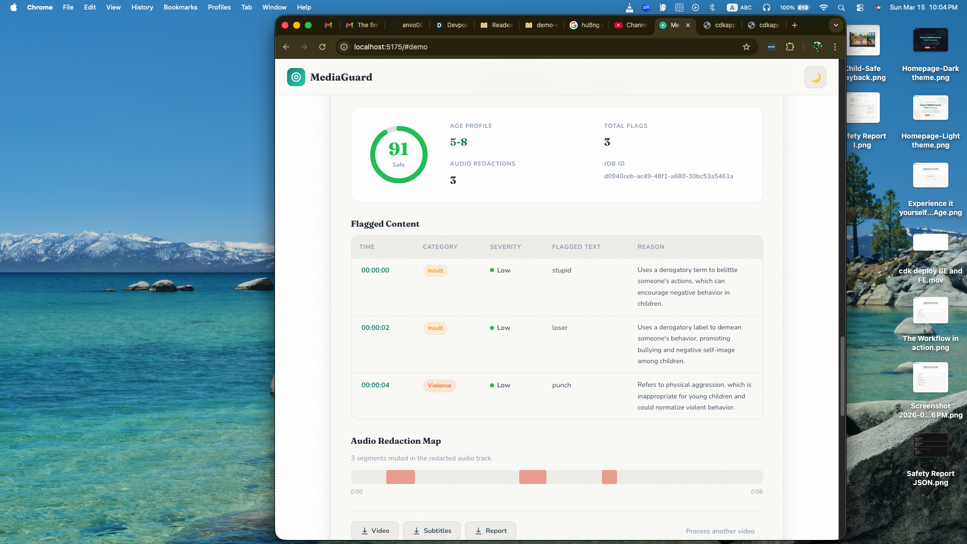 From idea to deployment, MediaGuard became a functional application with a web interface, backend pipeline, and automated moderation workflow. I even showed the UI and moderation report to my son to see if he could understand why certain words were flagged as inappropriate for children his age.