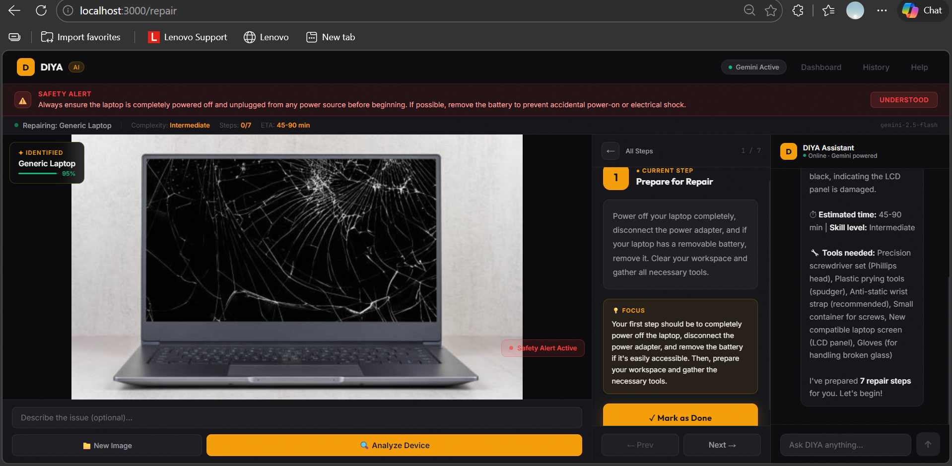 Architecture: User uploads image ↓ Gemini Vision → JSON (device, steps, safety alerts, tools) ↓ React UI renders 3-panel layout: [Image View] [Step-by-Step Guide] [DIYA Chat] ↓ User asks questions → Gemini streams response live