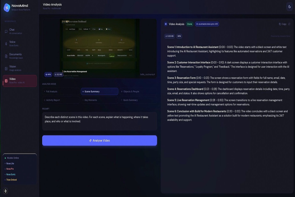 Video Understanding — Videos up to 25 MB are sent to Amazon Nova Pro, which samples frames automatically at 1 fps up to 960 frames across six analysis preset modes. Nova Lite serves as automatic fallback.