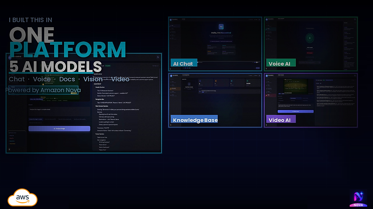 NovaMind is an enterprise-grade multimodal AI platform that unifies five Amazon Nova foundation models into one production-ready application.