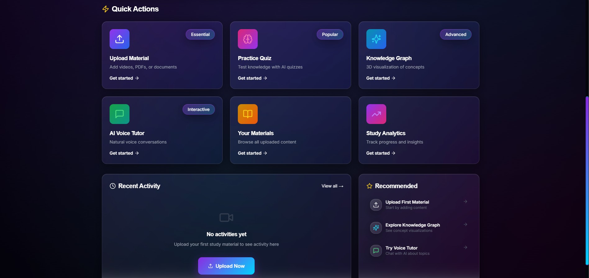 It lets users upload lecture videos, PDFs, and notes, then processes that material into structured study assets such as searchable content, concept relationships, quizzes, and analytics. The platform is designed around a few core workflows: