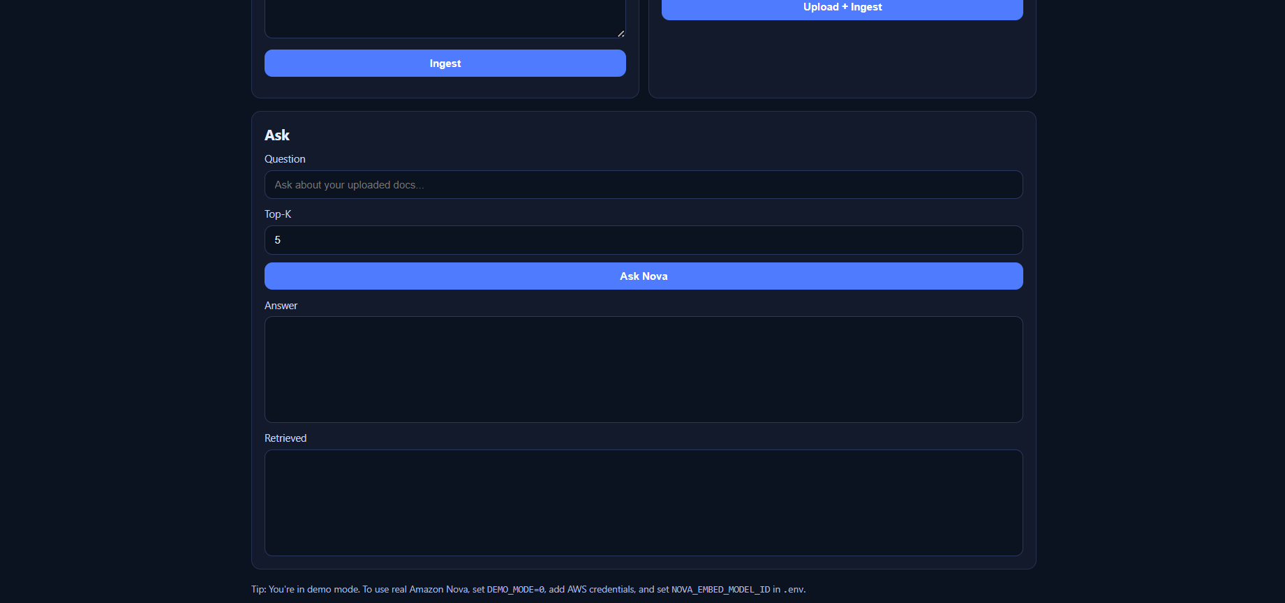 - Showcase real Nova: When you’re ready, flipping one flag and adding credentials switches to real Amazon Nova Lite for chat and Nova embeddings for retrieval—the same stack you’d use in production.