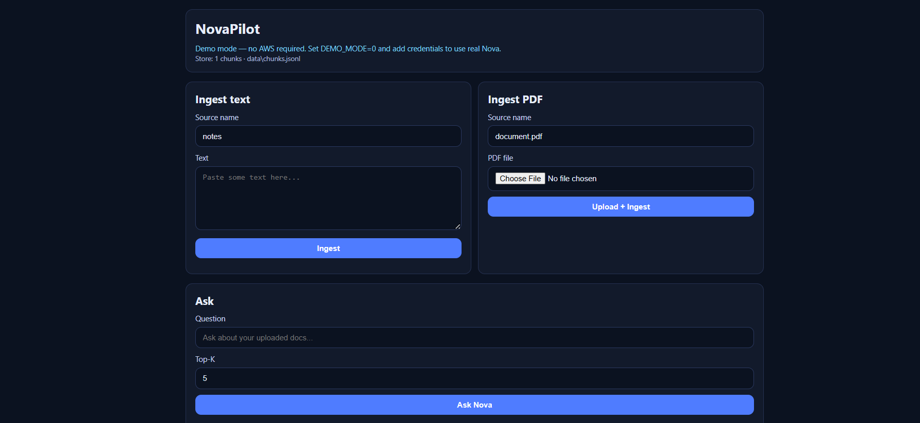 [source=... id=...]and pass it plus the question to Nova Lite with a system prompt that says “ground answers in the context and cite sources.” - Demo mode: If