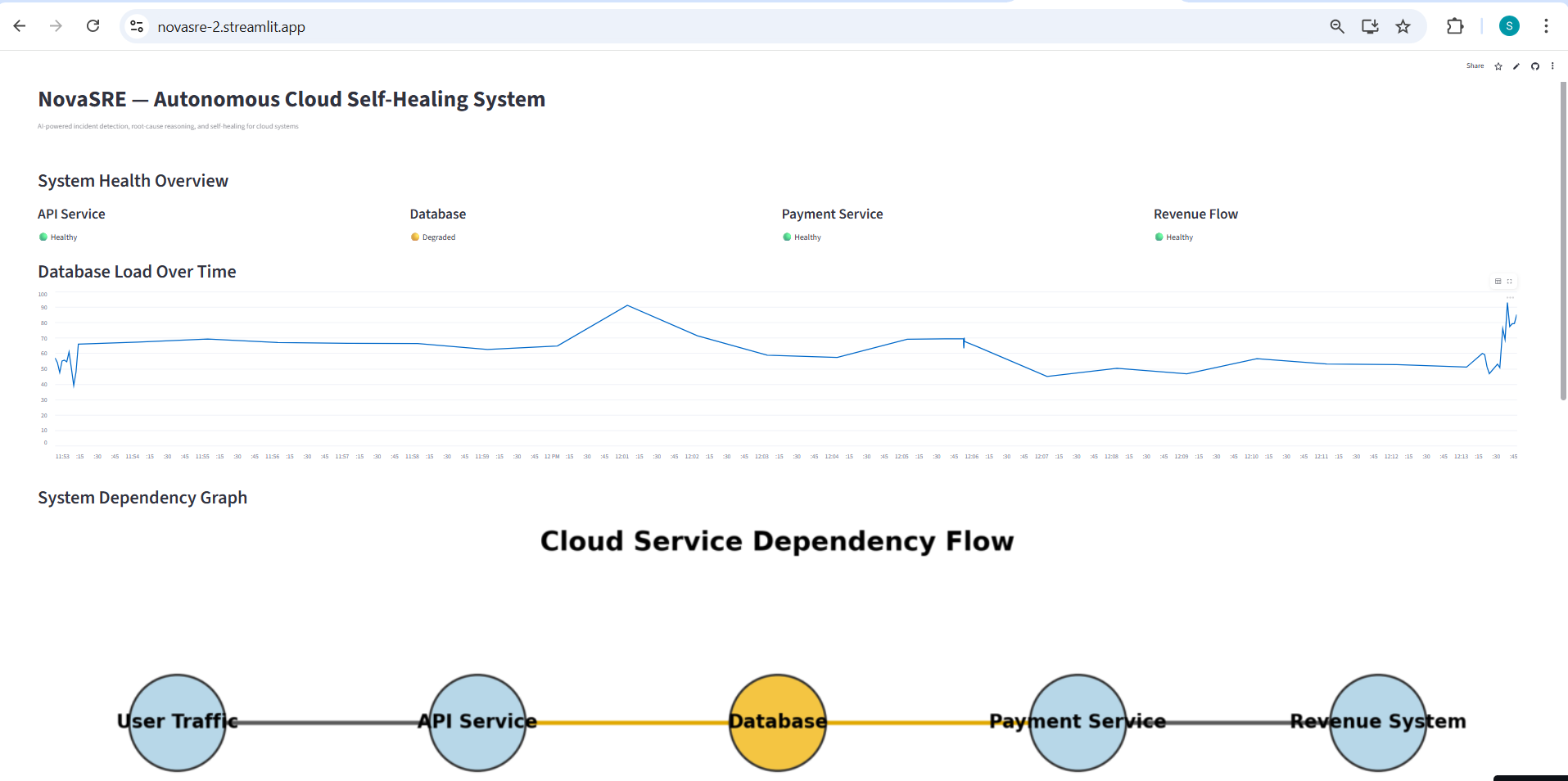 NovaSRE is an autonomous cloud self-healing system that simulates live infrastructure telemetry and incident response.