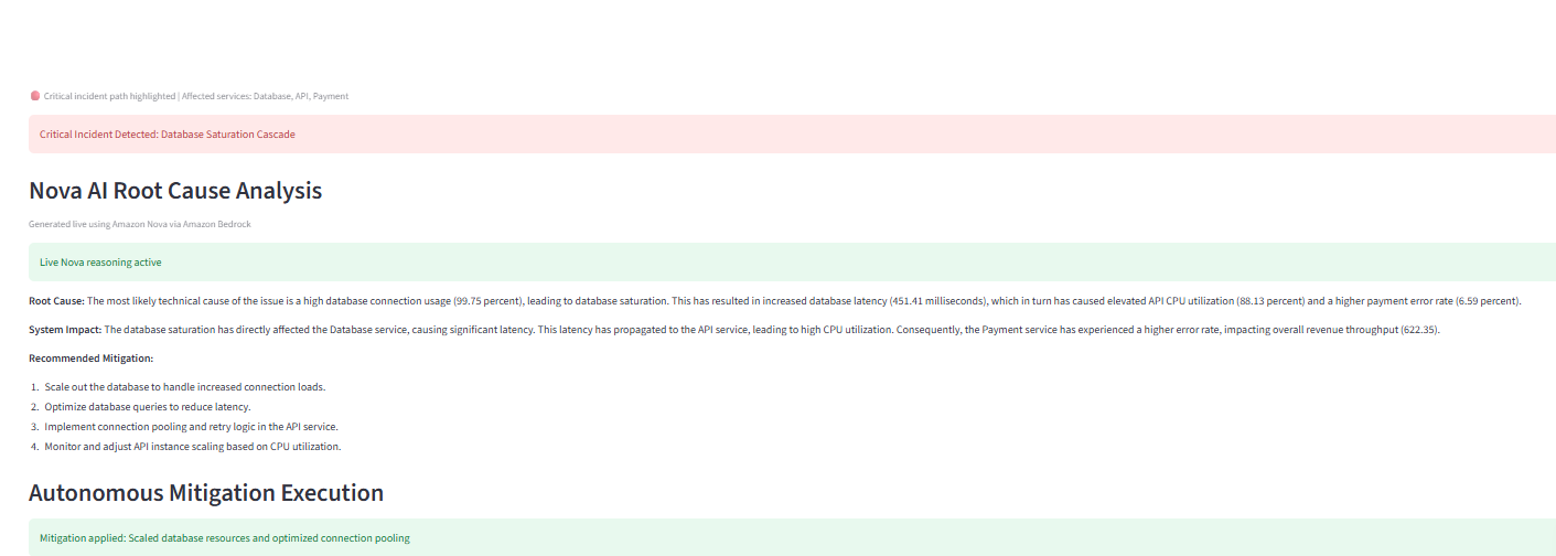 Amazon Nova-powered root cause analysis during a critical database saturation incident, followed by mitigation to stabilize system.