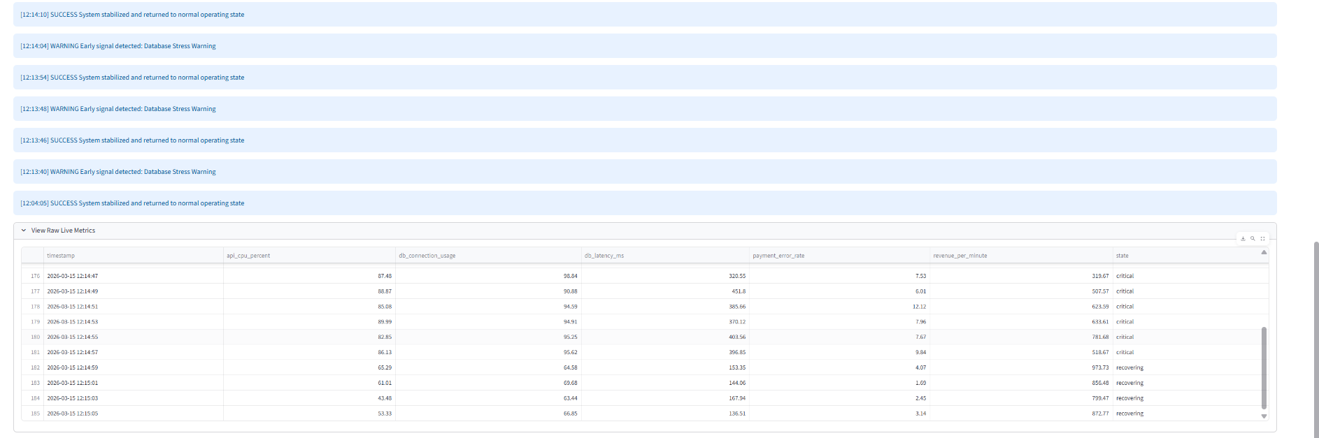 One challenge was designing the system so that it felt like a real autonomous workflow instead of just a dashboard with random numbers. I needed the metrics, incident thresholds, reasoning flow, mitigation behavior, and recovery logic to all connect meaningfully.