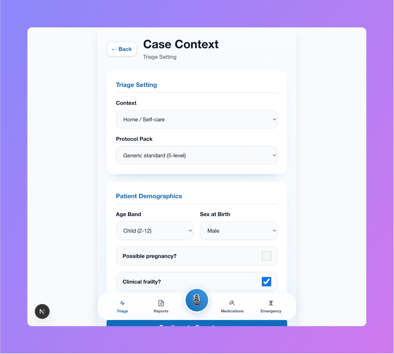 The UI guides users through a structured triage flow: