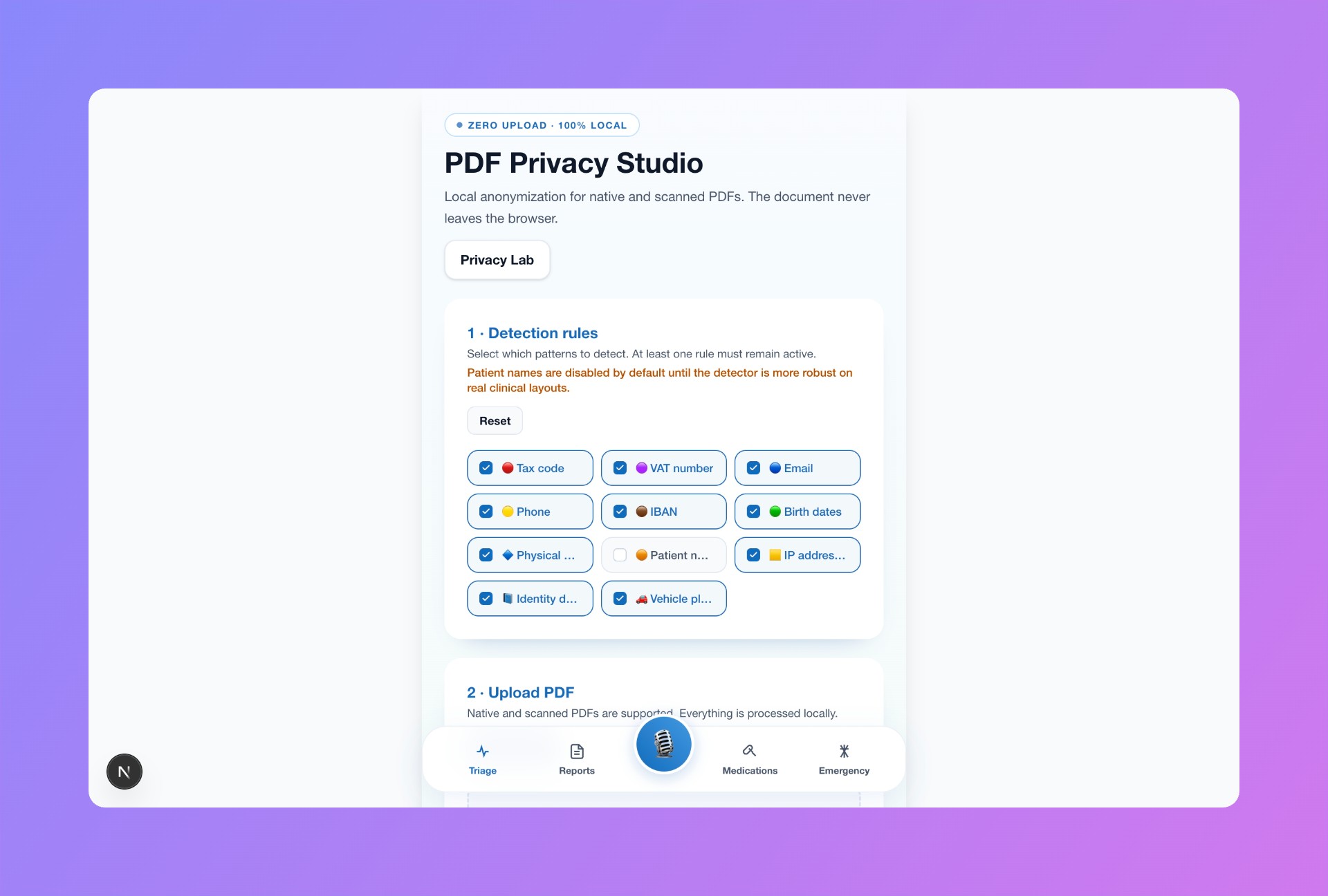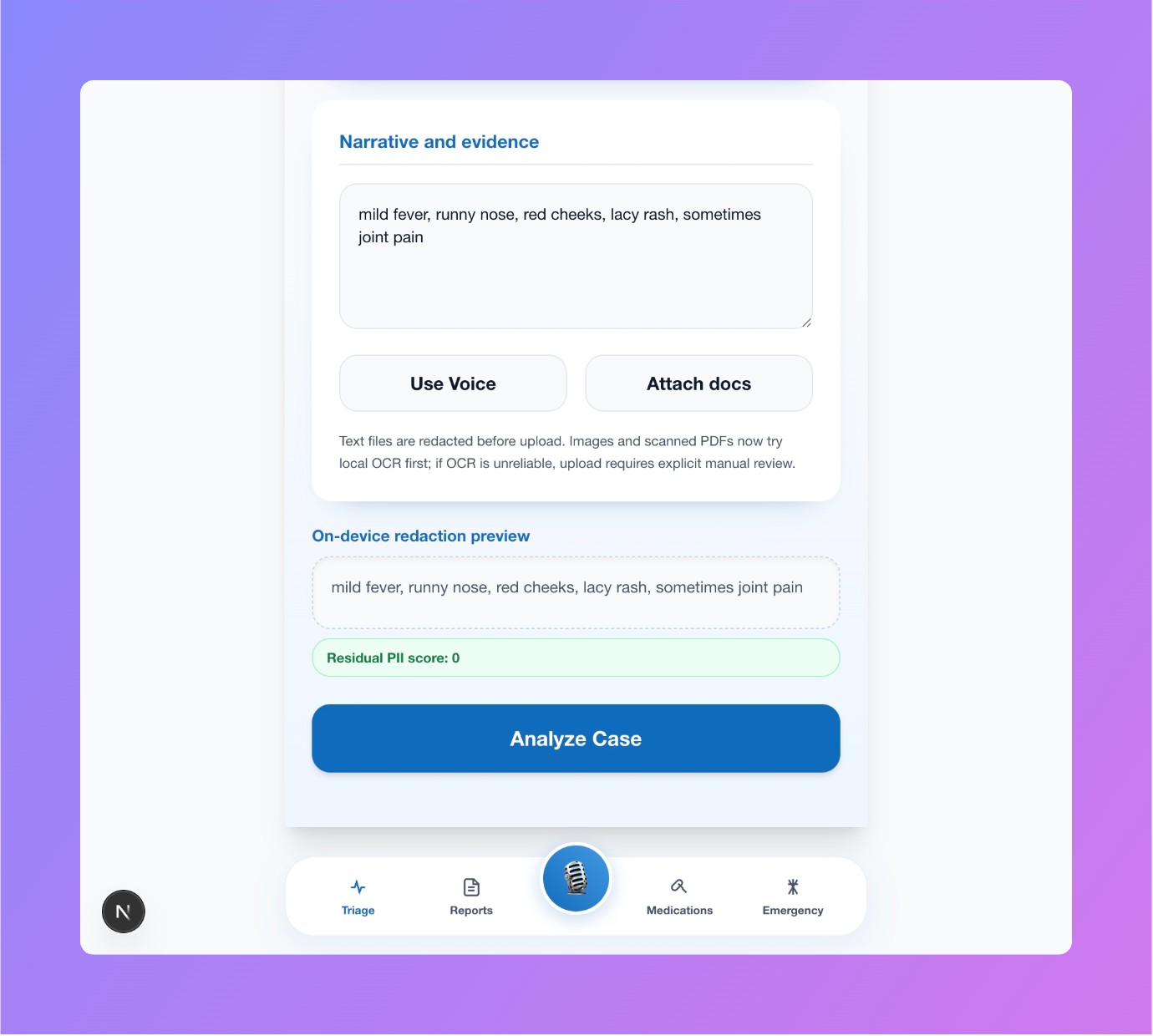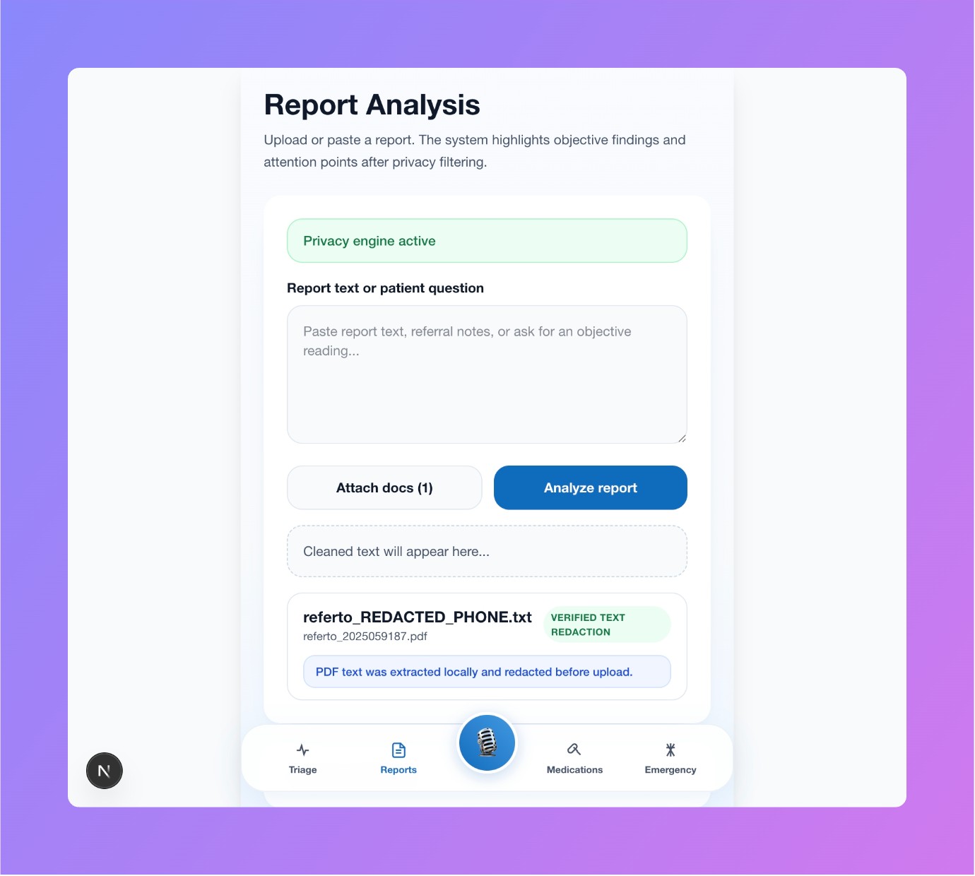 A client-side privacy engine runs before any backend request. It detects and anonymizes sensitive information such as names, emails, phone numbers, and identifiers, replacing them with anonymized patient aliases.