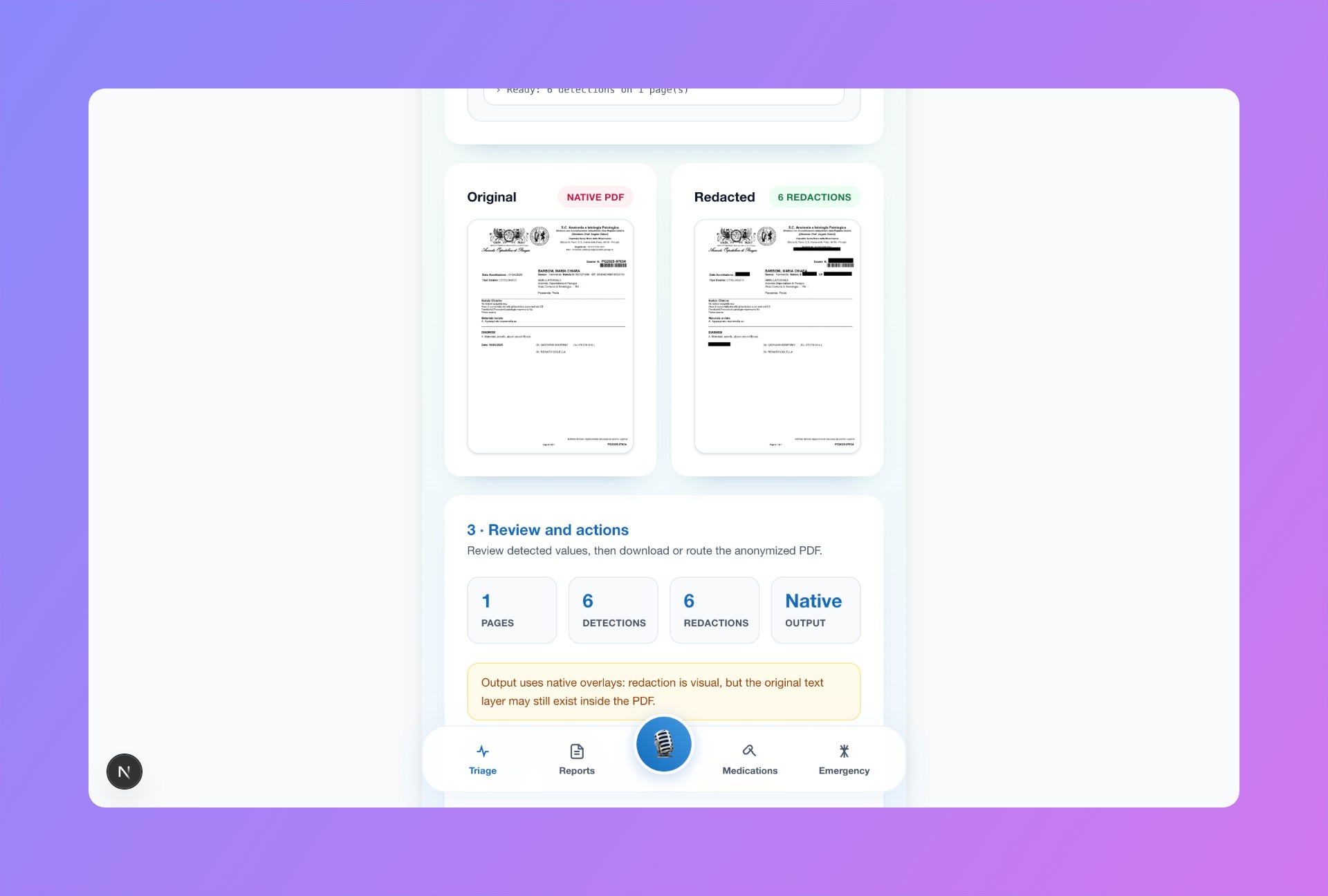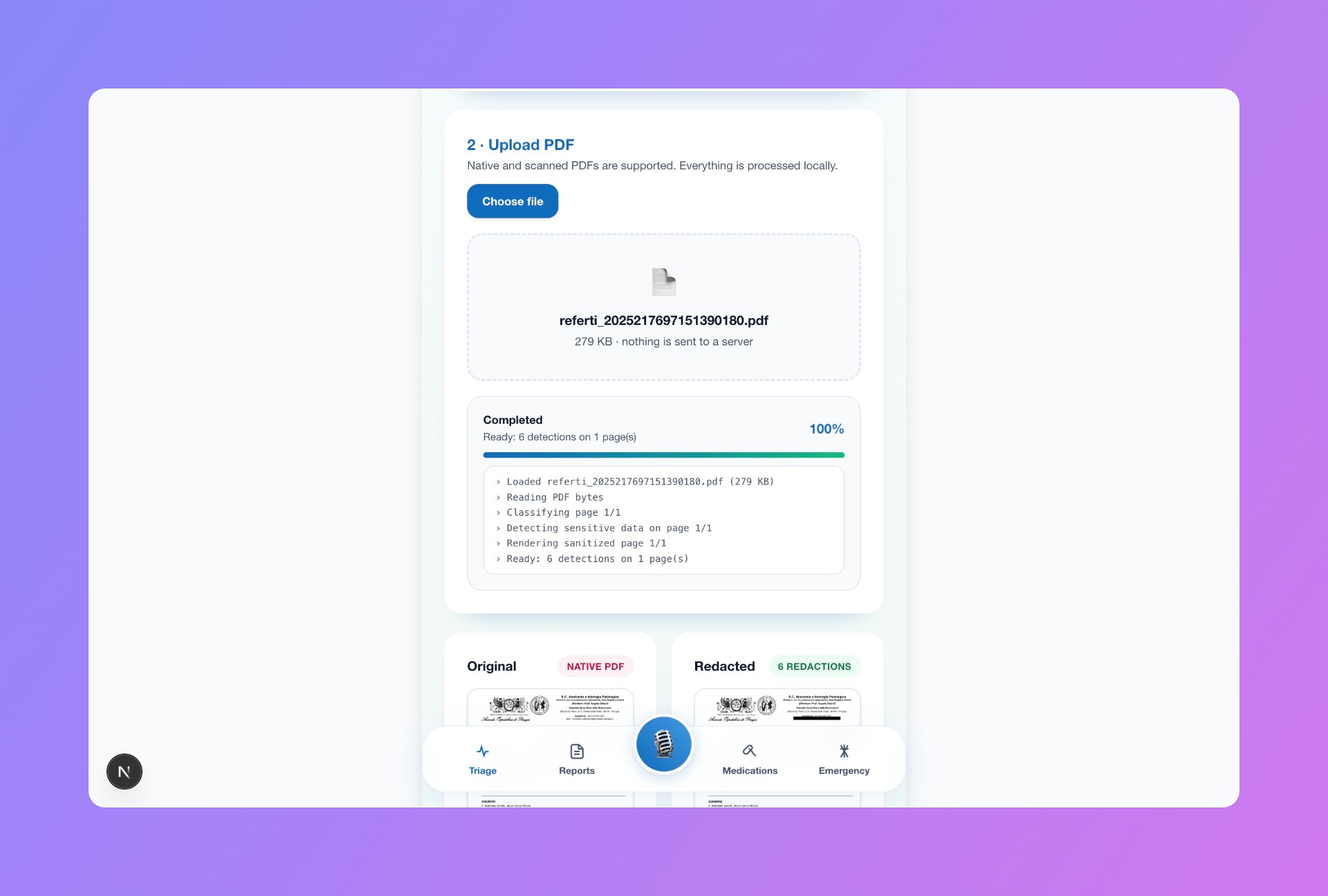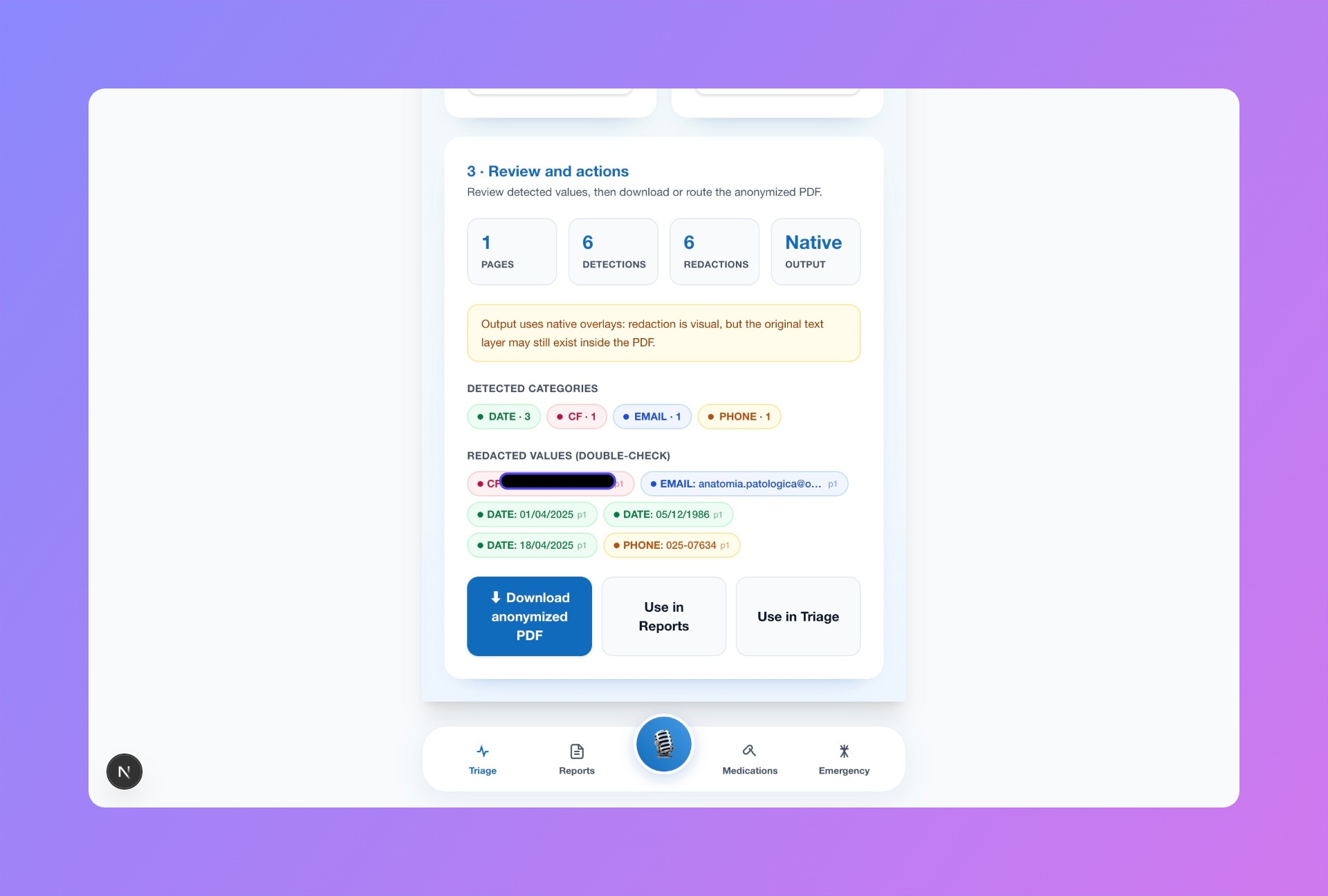 A client-side privacy engine runs before any backend request. It detects and anonymizes sensitive information such as names, emails, phone numbers, and identifiers, replacing them with anonymized patient aliases.