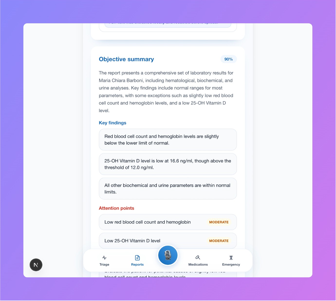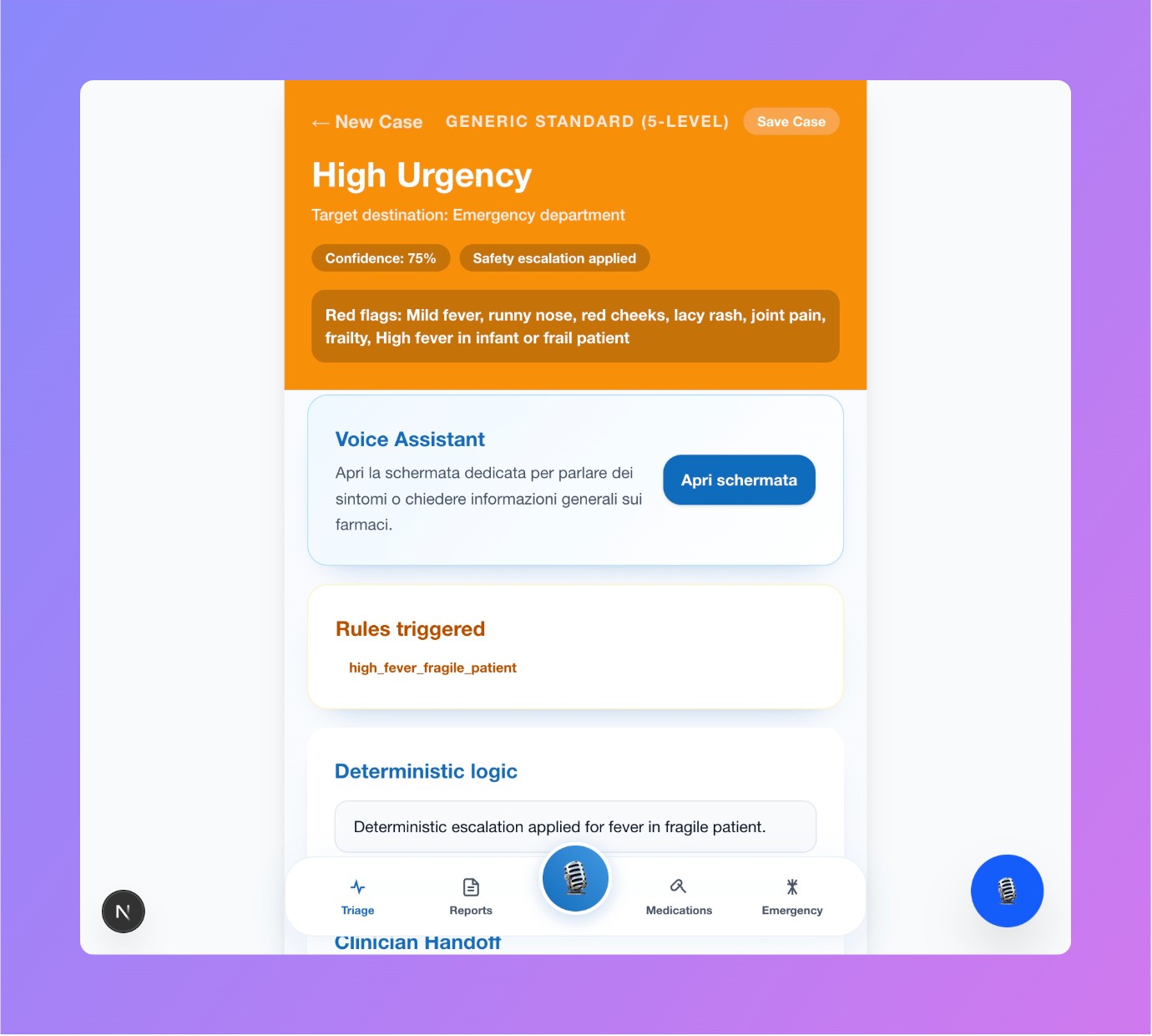 - Urgency result and clinician handoff summary