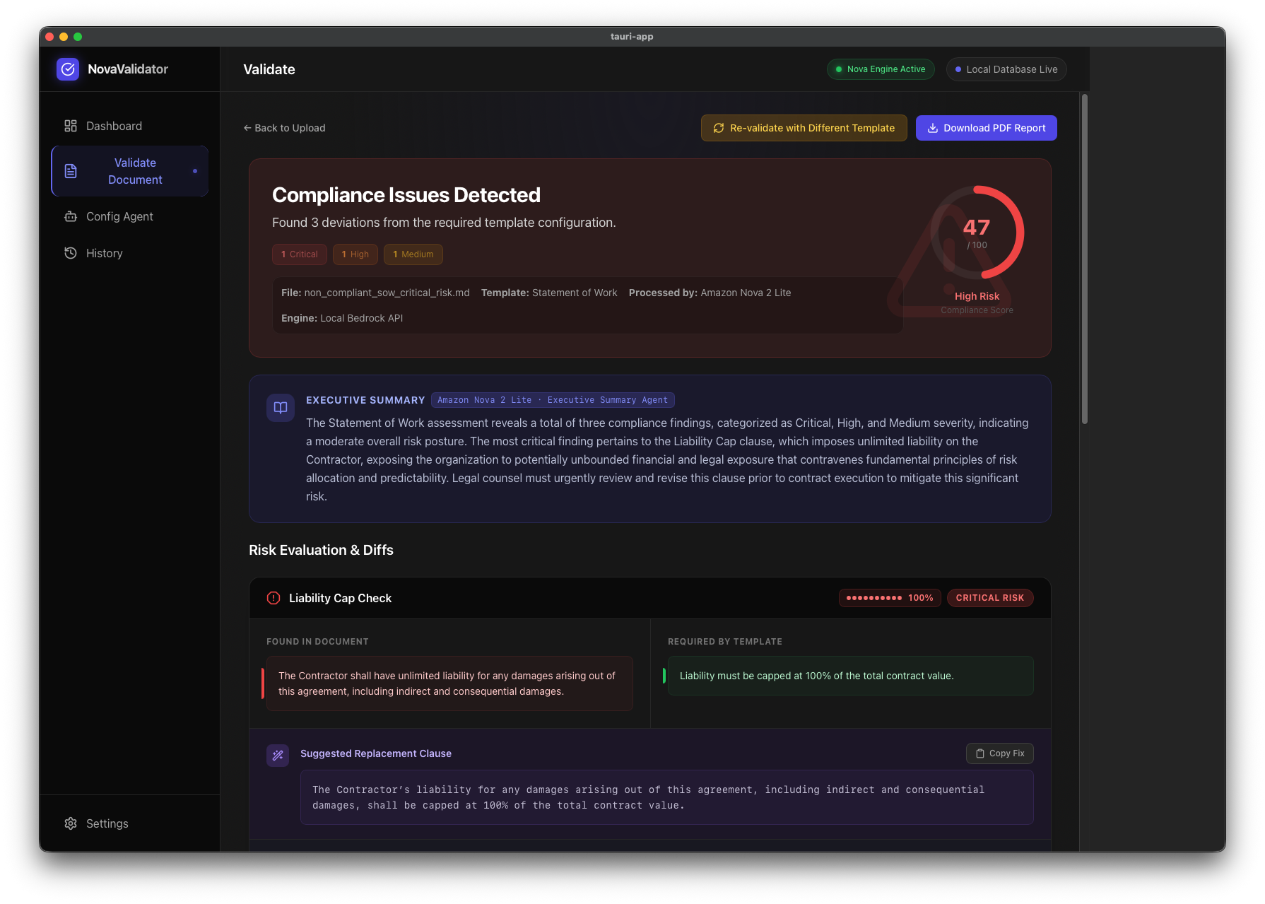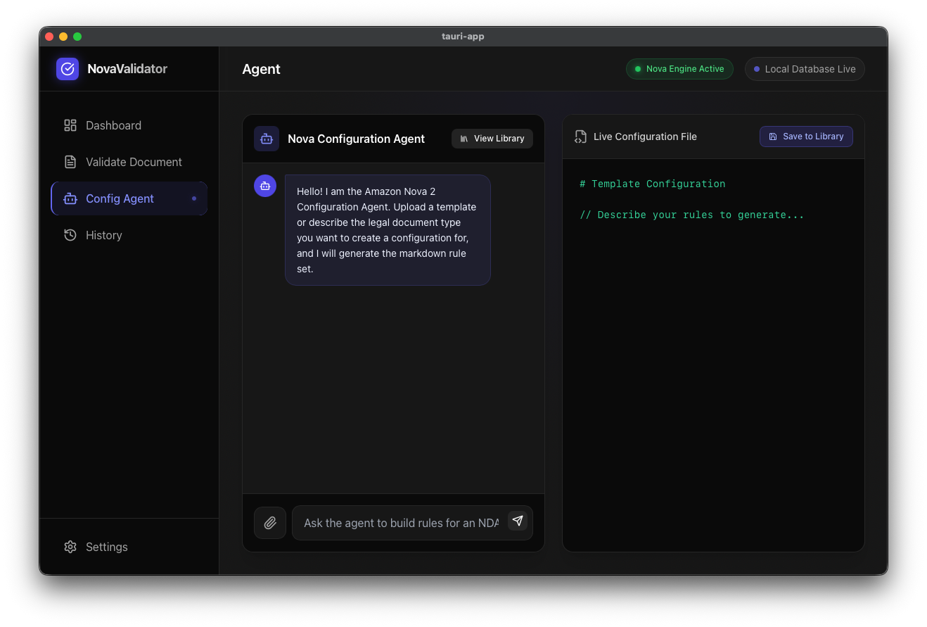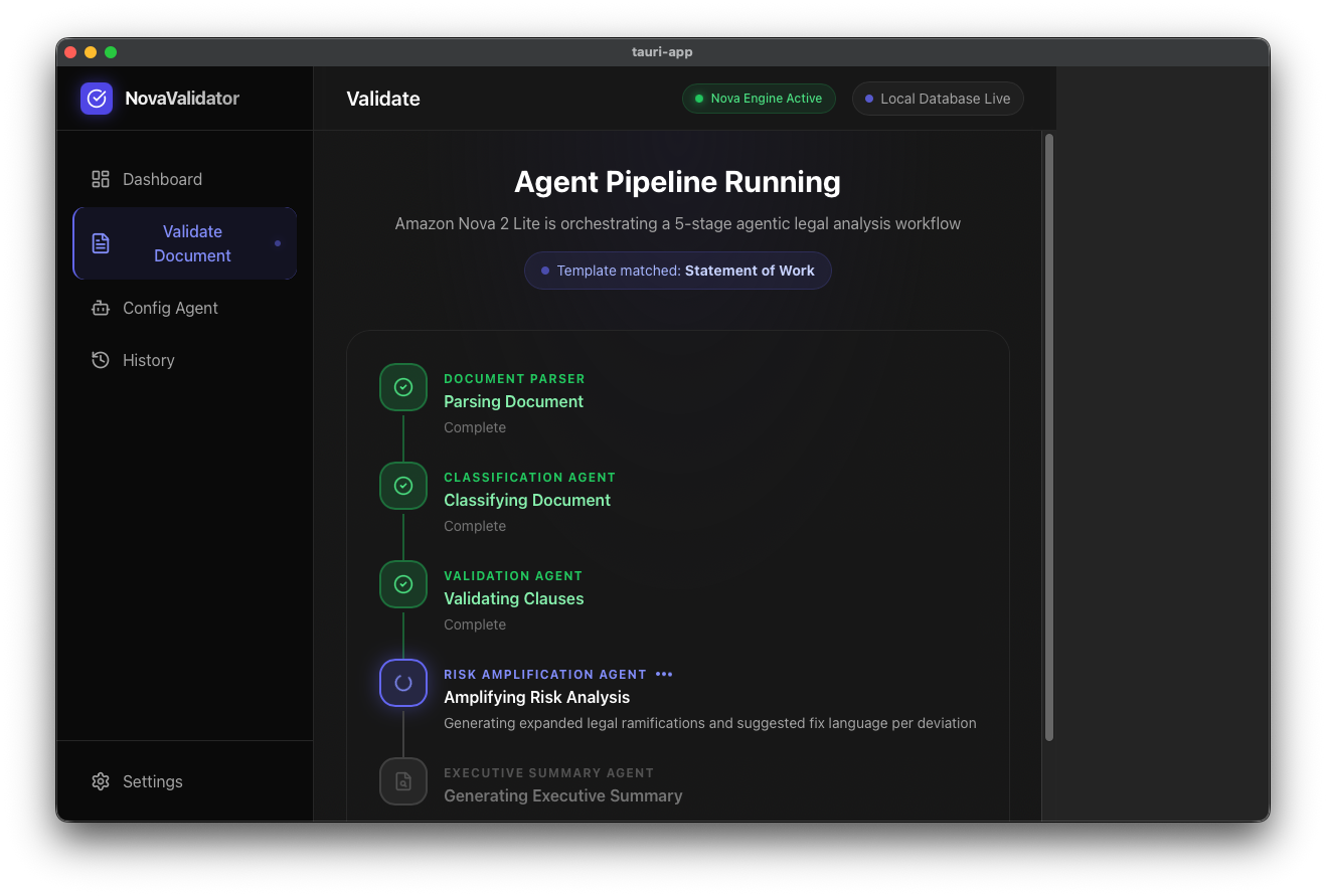 NovaValidator is a local-first, AI-powered legal document compliance platform. Users can drag and drop any type of legal document into the app and a multi-step agentic pipeline powered by Amazon Nova 2 Lite takes over: