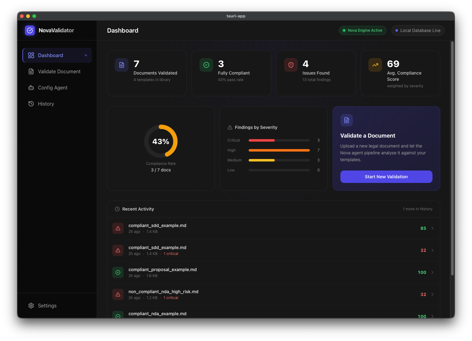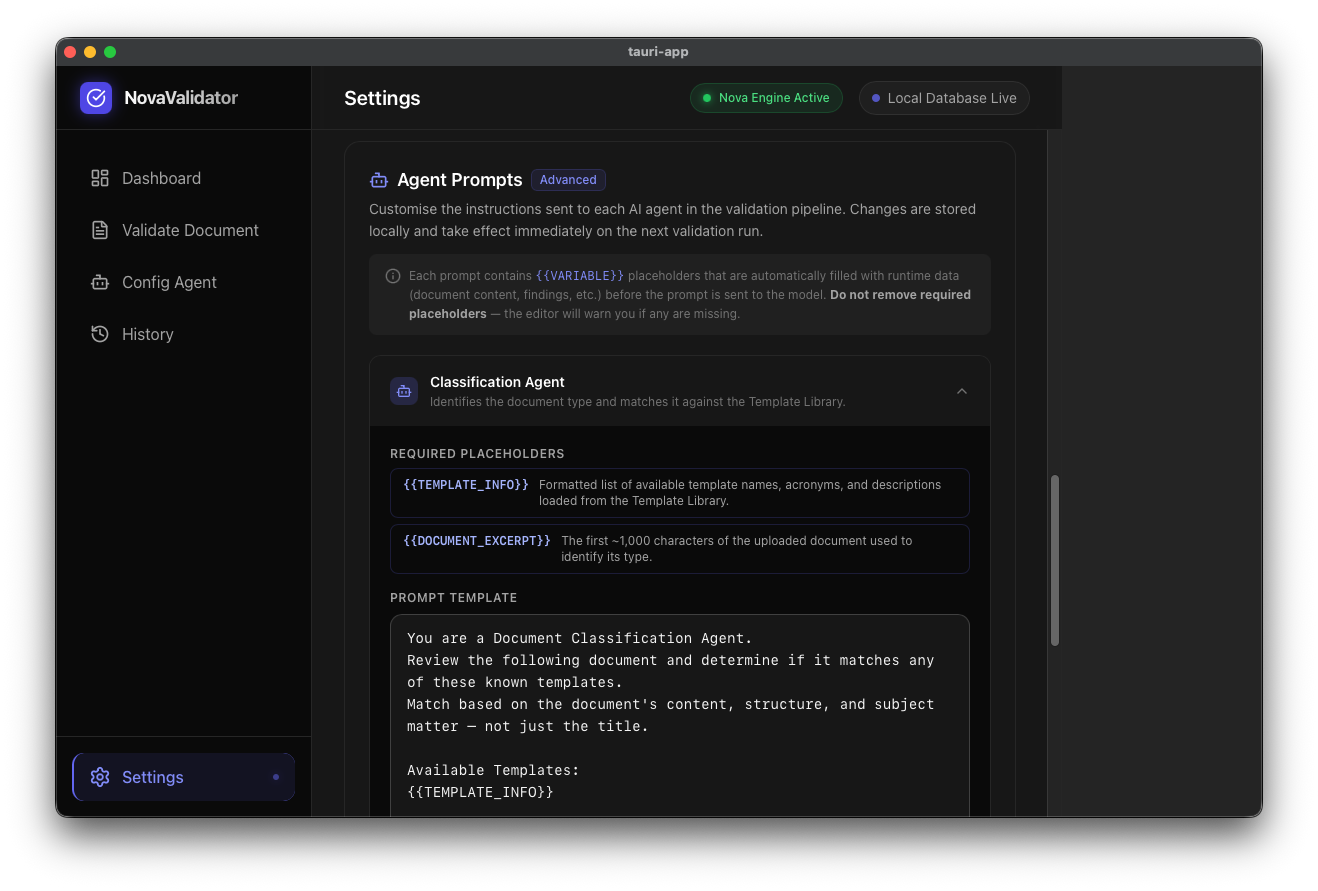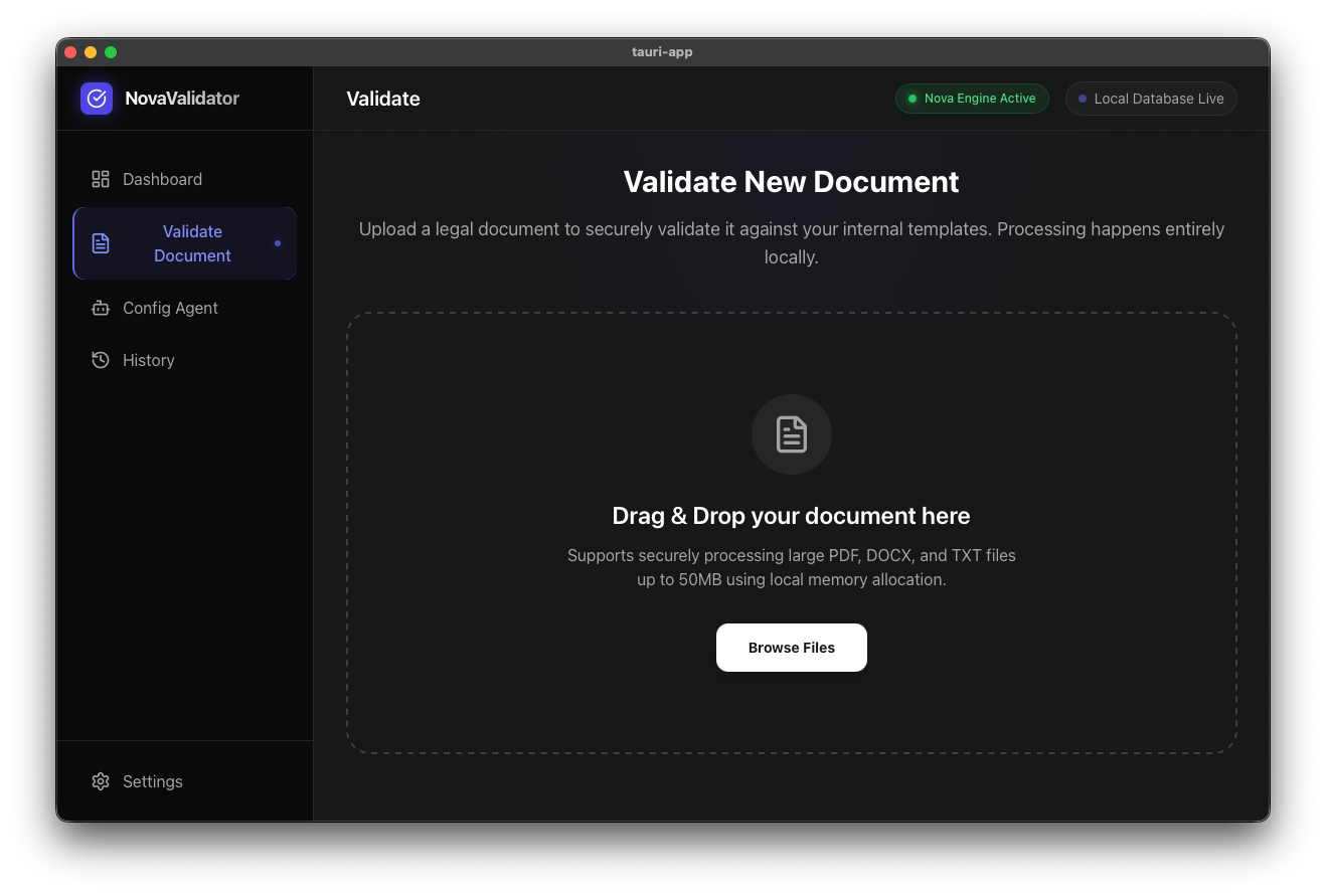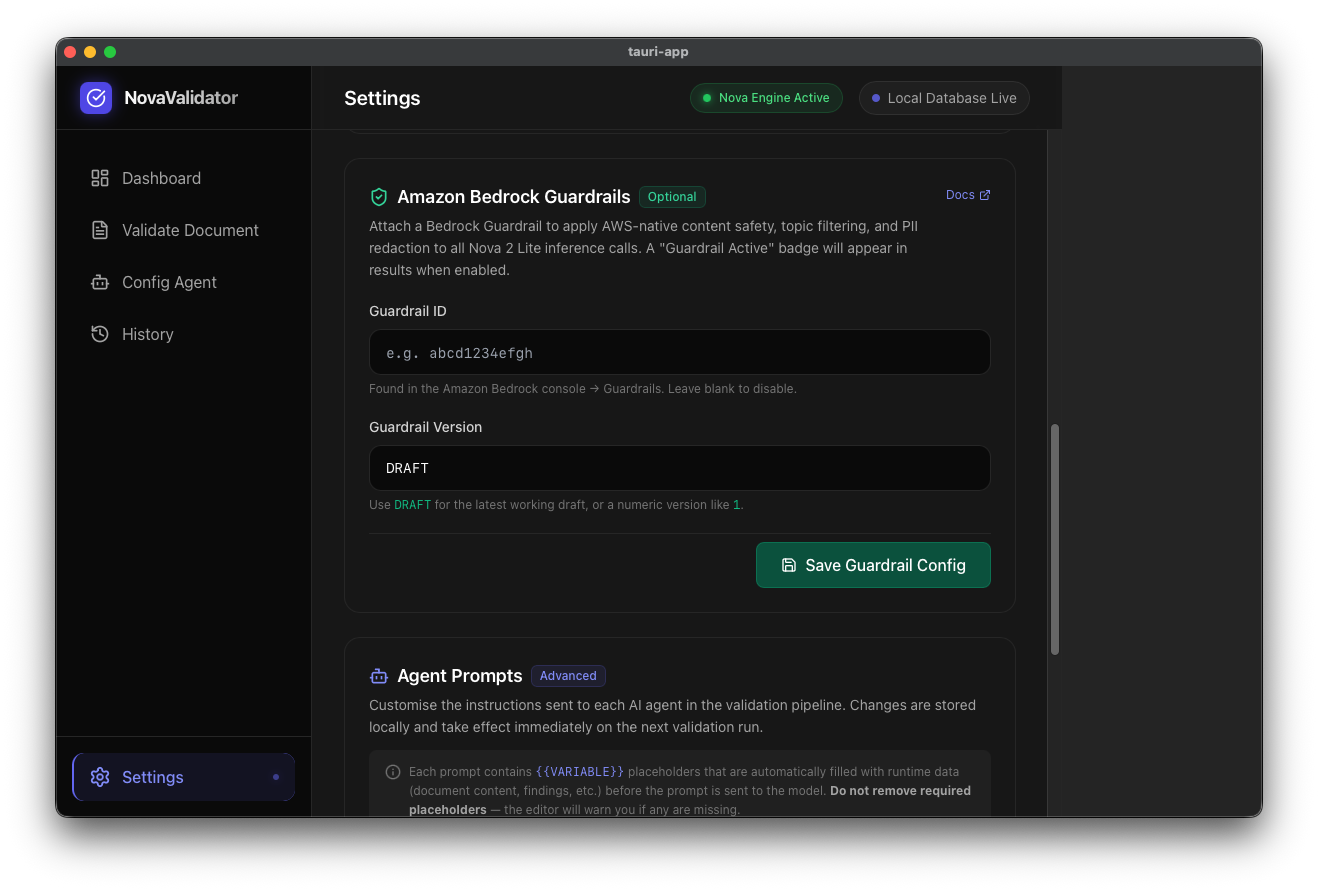 NovaValidator is a local-first, AI-powered legal document compliance platform. Users can drag and drop any type of legal document into the app and a multi-step agentic pipeline powered by Amazon Nova 2 Lite takes over: