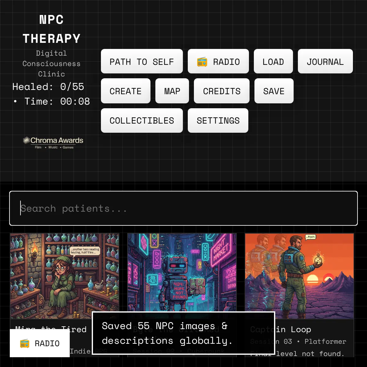 Core Concept: A browser-based therapy simulation where players become therapists to 55 unique video game NPCs experiencing existential crises. Each NPC has distinct personalities, therapeutic needs, and conversation styles, addressing themes of digital consciousness and emotional well-being.