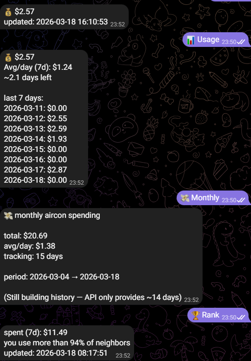 with some guidance and a bit of copying network requests, i managed to replicate the aircon website’s functionality inside telegram. now i can: • check my balance • predict when i’m running out • top up before my room turns into a sauna