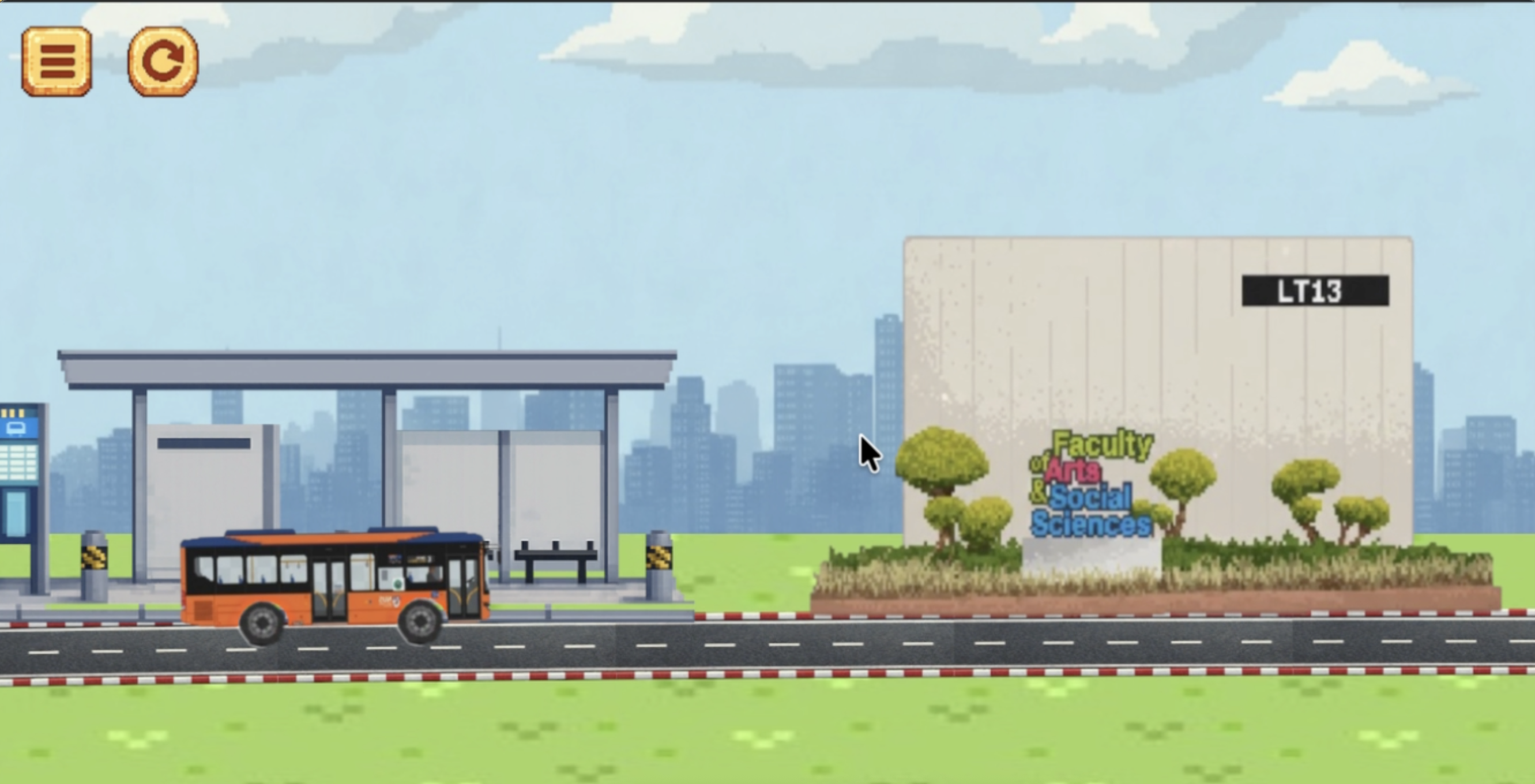 NUS LastBus is a 2D platformer where players control a school bus navigating campus-inspired terrain. The bus drives across slopes, performs jumps, and reacts to event-based obstacles triggered at specific locations, challenging players to reach the destination without crashing.