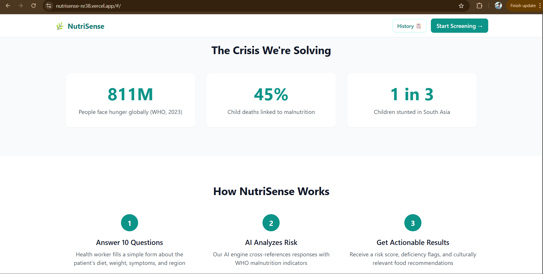 811 million people face food insecurity. 45% of child deaths are linked to malnutrition. Community health workers visit millions of homes every year but have no digital tools to screen for it. We built NutriSense to change that.