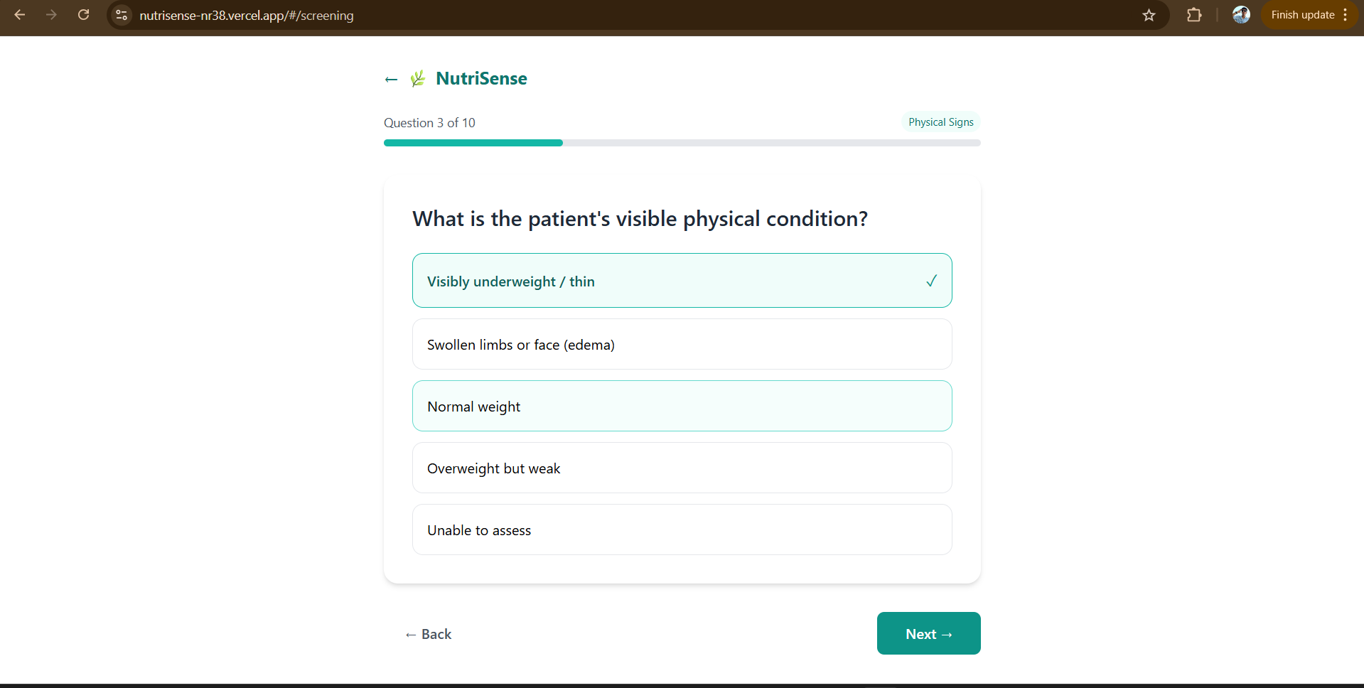 NutriSense lets community health workers screen patients for malnutrition risk in under 2 minutes. Answer 10 simple questions → get an AI-powered risk score, nutrient deficiency flags, actionable recommendations, and locally available food suggestions. All past screenings are saved in a history dashboard on the device. Works offline. Free forever.