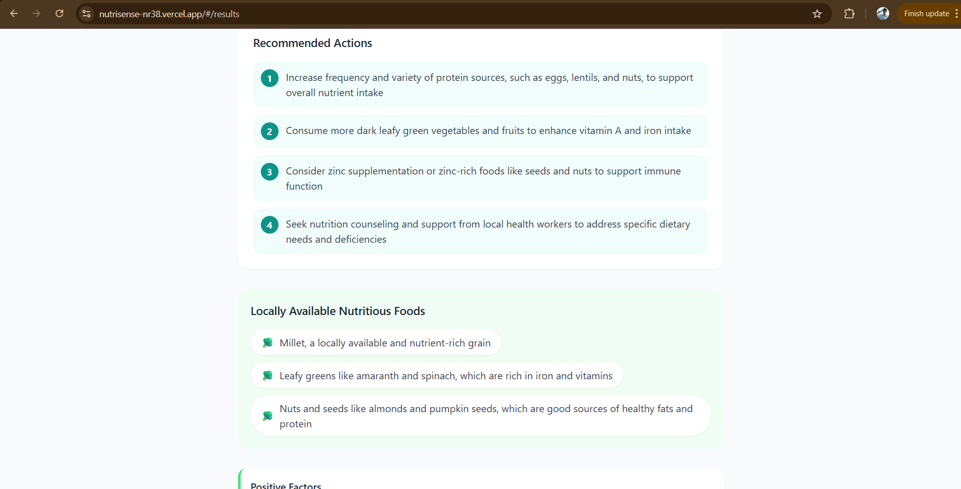 The AI gives region-specific food recommendations, it suggested mung beans and fortified atta for an urban slum patient in India. That level of contextual accuracy from a simple 10-question form exceeded our expectations.