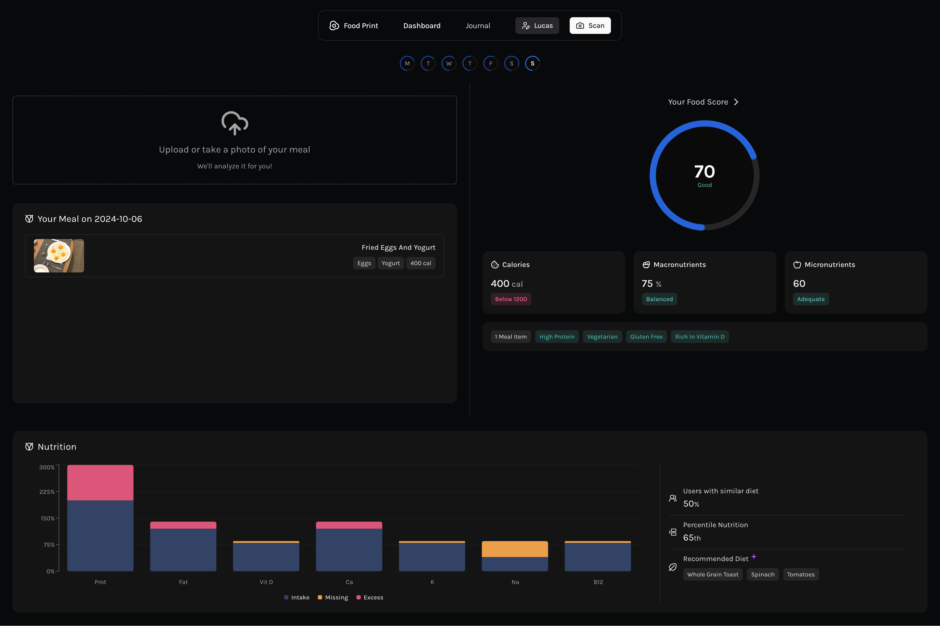 FoodPrint is an app that allows users to take a picture of their meal, analyzes its nutritional content, and provides suggestions on how to improve the biggest gaps in nutrition using affordable and accessible ingredients. It is designed for people in food deserts in mind, who have limited access to fresh and affordable ingredients. Through the anonymous collection of these photos, it contributes to data on the types of foods consumed and largest areas where nutrition is lacking in local communities. The data from this app contributes to valuable insights for researchers working to address food insecurity in areas lacking local and community-specific context.