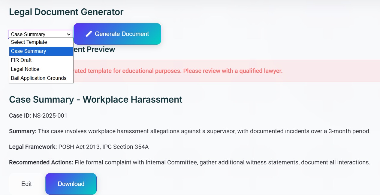 Challenges we ran into We faced many challenges: Legal data is very unorganized, so cleaning and training took time. We had to avoid giving “direct legal advice,” so we built a story-mode system. Adding bias and power detection was difficult. Creating correct evidence checklists for different cases was challenging. Building full privacy and encryption took extra effort.Designing an interface that feels safe for harassment victims required care. Making the tool multilingual was harder than expected.But we learned and solved each issue step by step.