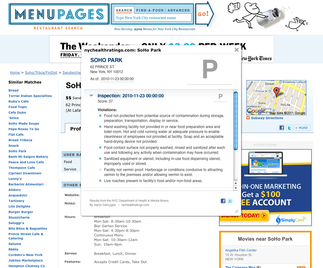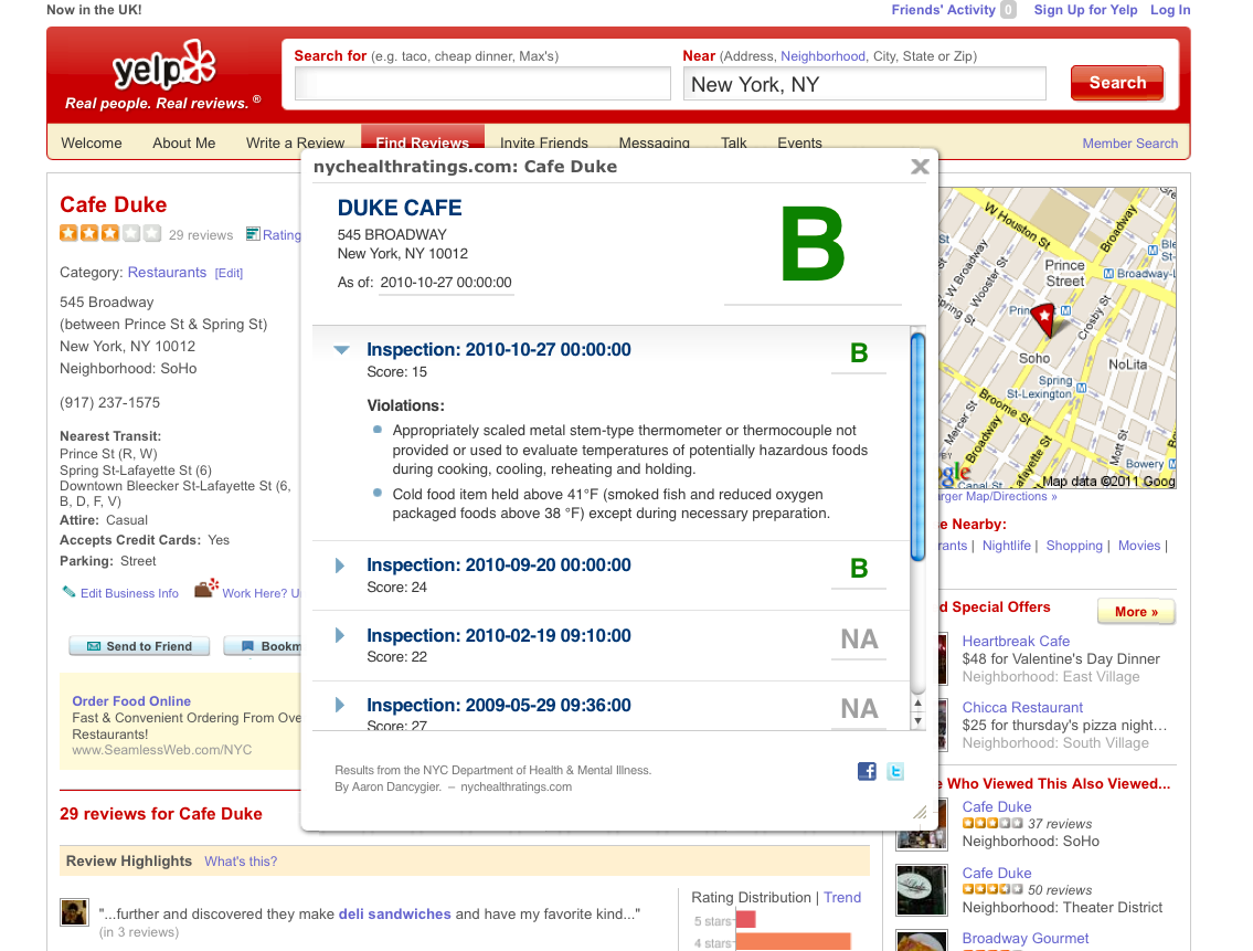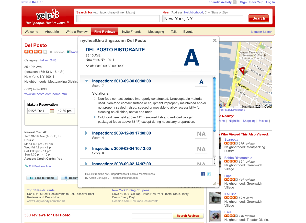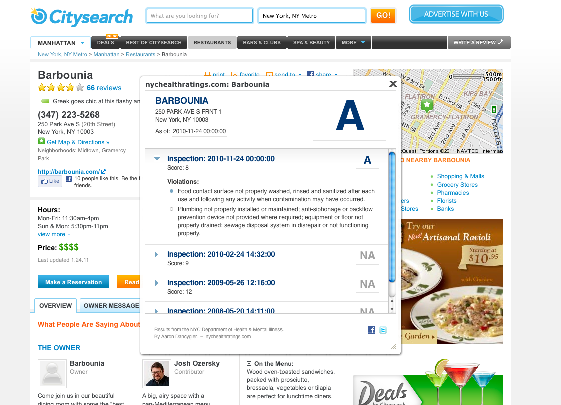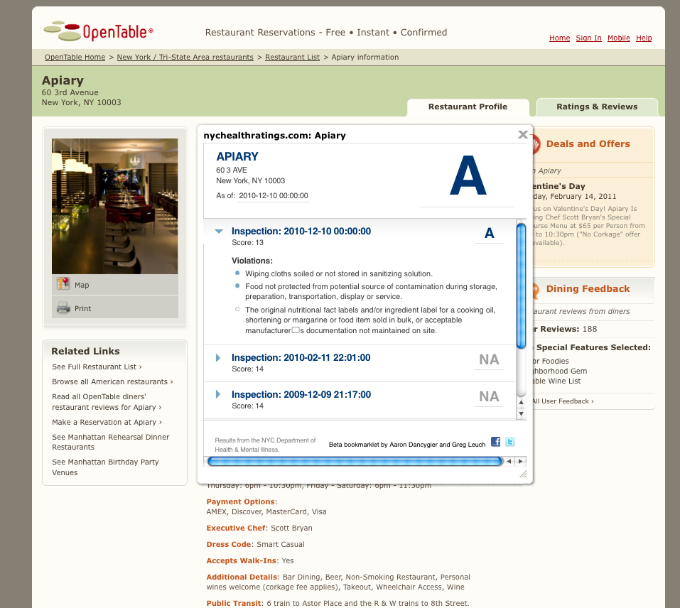 Our applcation is a javascript bookmarklet link that integrates the New York City Department of Mental Hygiene restaurant inspections data with the restaurant landing pages of yelp.com, citysearch.com, menupages.com and opentable.com. To use this application visit http://www.nychealthratings.com and drag the bookmarklet link to your toolbar. When you visit a restaurant landing page on yelp.com, citysearch.com, menupages.com or opentable.com simply click the bookmarklet link. Your results should appear in an iframe layer. We decided to build this as a bookmarklet in order to reach the most people possible.