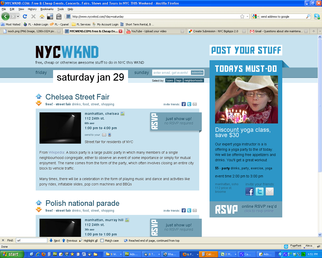 What's going on this weekend? Now you know. NYCWKND is the place to share NY at it finest including great activities, public events and sponsored events with other New Yorkers and tourists. NYCWKND is unique because the entire community can participate! While the NY city wide event calender is useful for looking at activities, individual NYers and tourists can't post events. In addition to this the comunity votes to determine which activities and events seem most appealing. Voting the activities up or down makes them more or less visible.Events can be shared with friends on social networks, or texted/emailed directly to your phone.And as this is bigapps 2.0, NYCWKND takes the true meaning of the word web 2.0. The site is a platform to share and create content, and it is tailored by user preference such as dynamic tag clouds and neighborhoods. Free and cheap events are from every spectrum of community life including: street fairs, parades, dances, grand openings, cultural events, parties, lectures. Here is a way for New Yorkers to get closer, and share in the great New York community spirit.