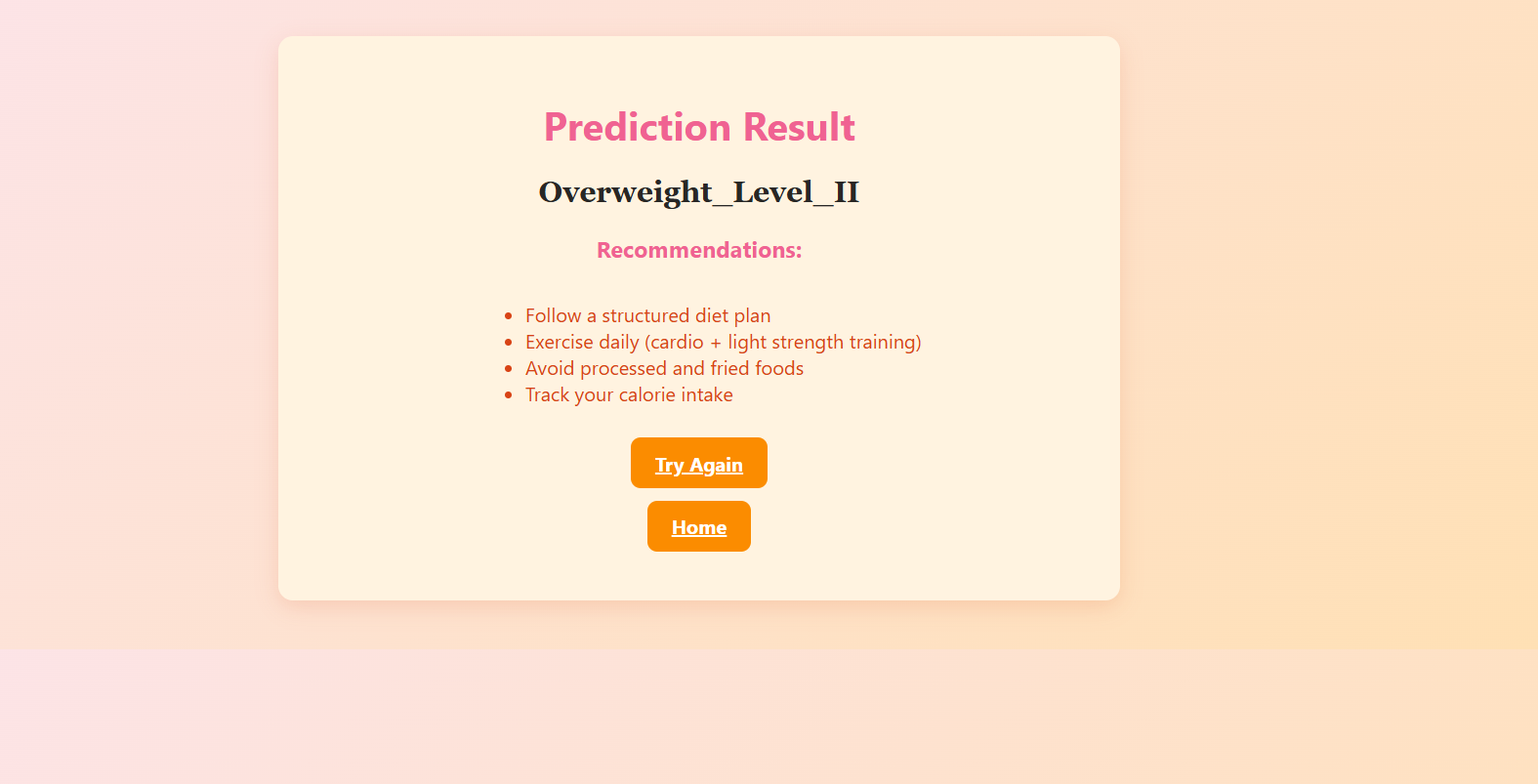 The inspiration for this project came from the increasing global prevalence of obesity and its associated health risks such as diabetes, cardiovascular diseases, and hypertension. The goal was to build a system that can help individuals understand their obesity risk early and take preventive action through data-driven insights.