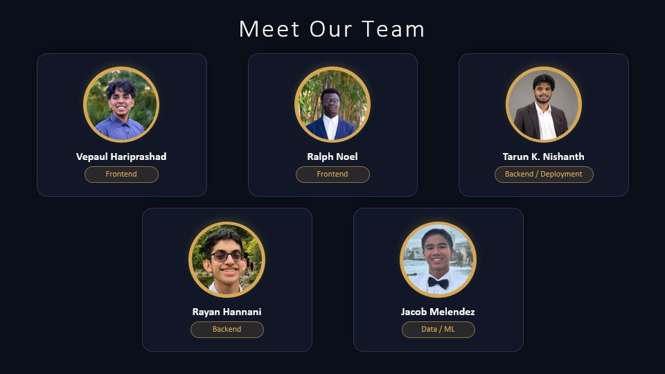 - Syncing across the stack: Five people, three layers of the system (ML, backend, frontend), and tight time constraints. Connecting everyone's work into a single coherent deployed app required active coordination throughout the build.