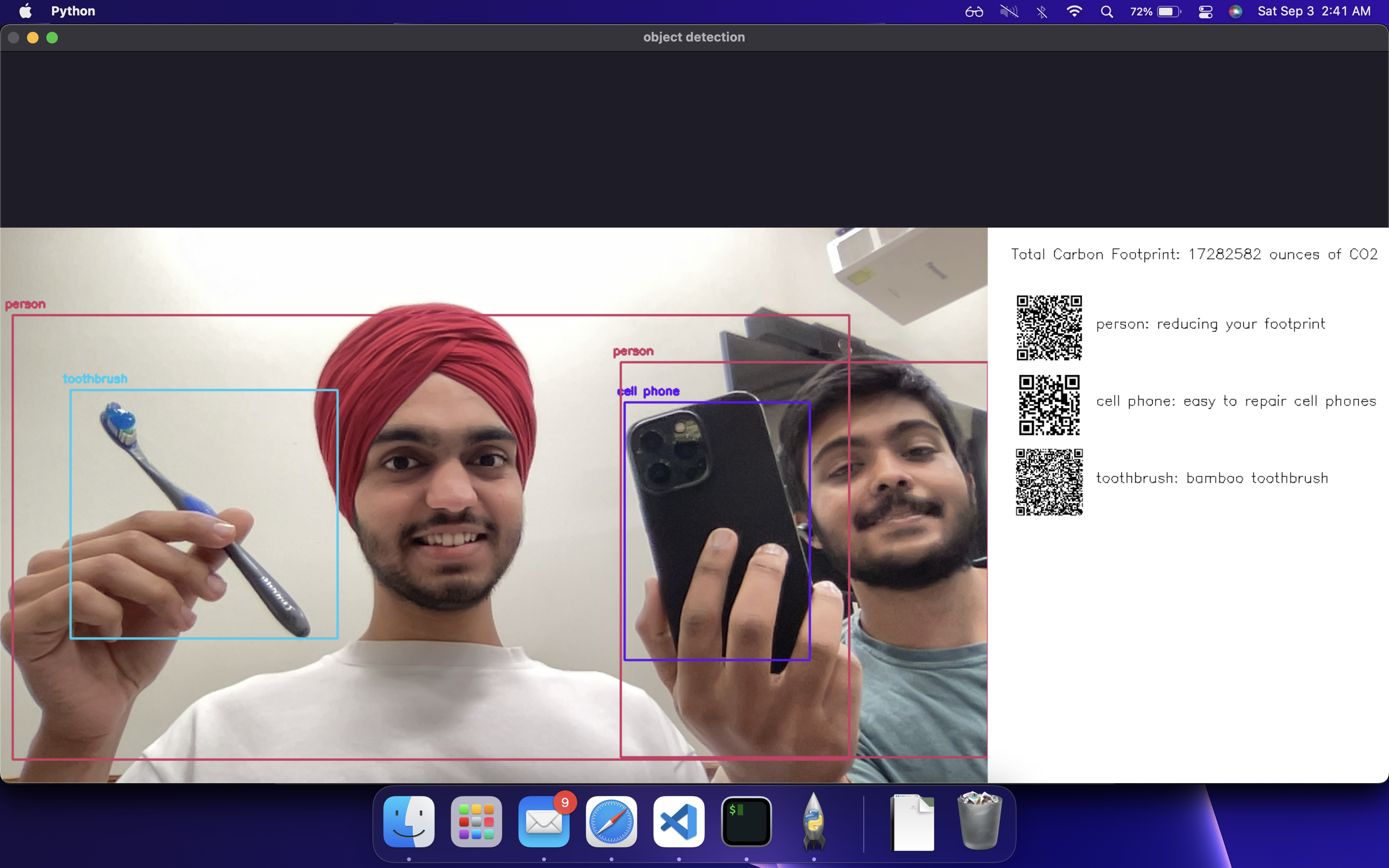 We built it using YOLOv3 object detection model in python and OpenCV to detect objects. Then we created a dictionary that contains all the information about the various objects we can detect. The dictionary contains information to different links for sustainable alternatives which are shown as QR codes on a side window.