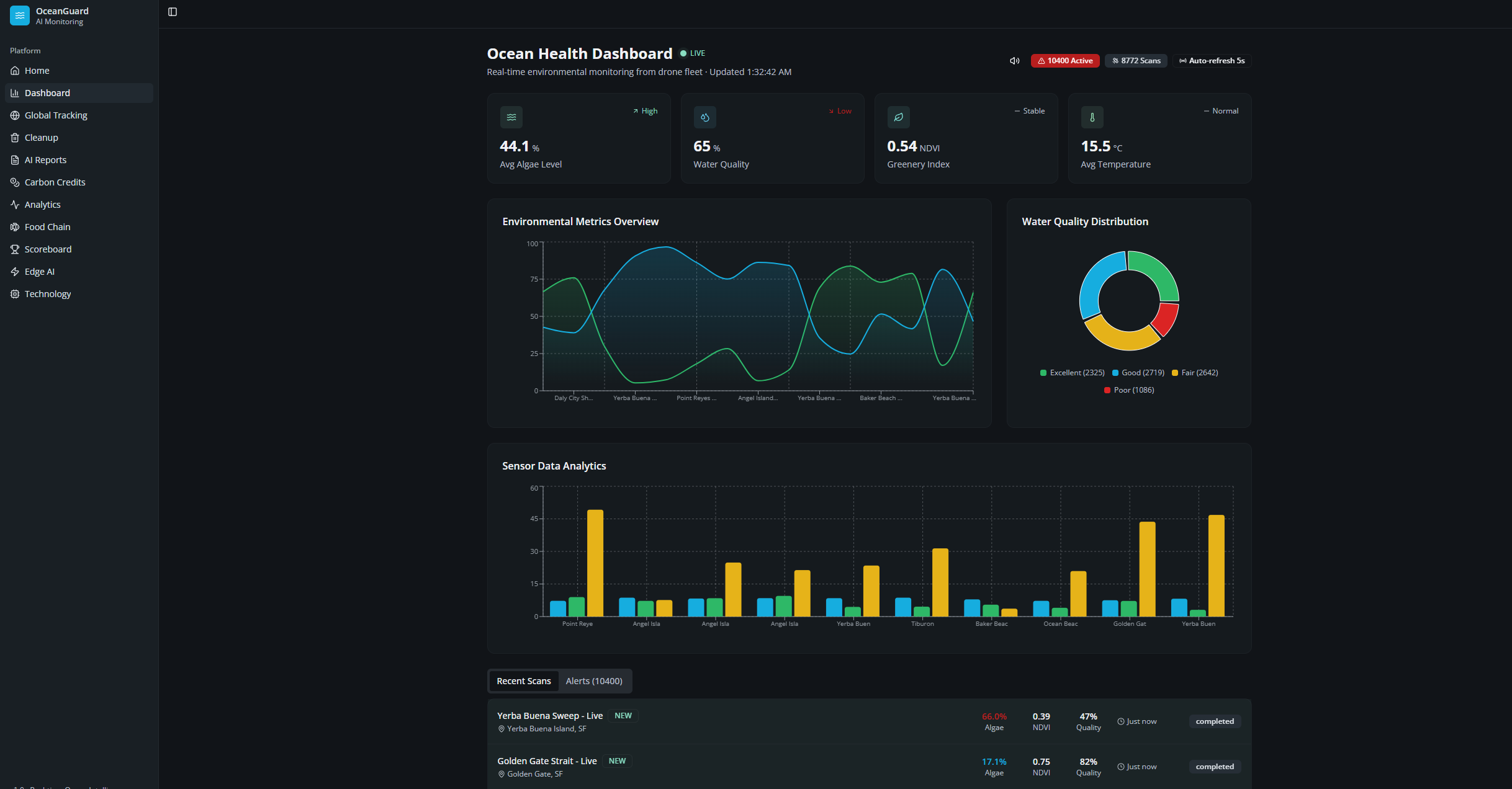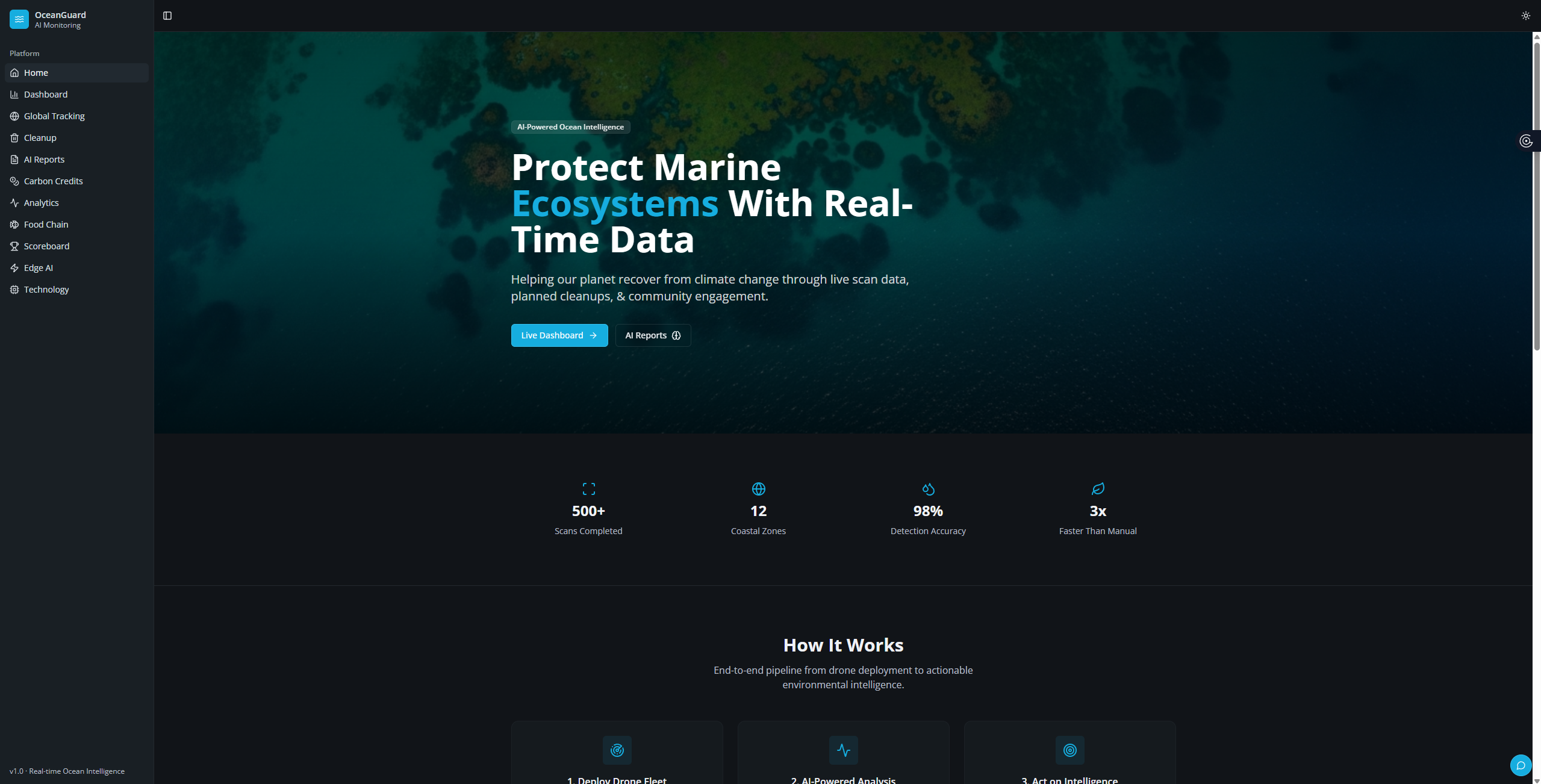 Our oceans are in crisis. Over 8 million tons of plastic enter the ocean every year, marine ecosystems are collapsing, and coastal communities lack the tools to respond effectively. Current monitoring is fragmented, slow, and reactive — by the time we detect a problem, the damage is done. We built OceanGuard to change that.