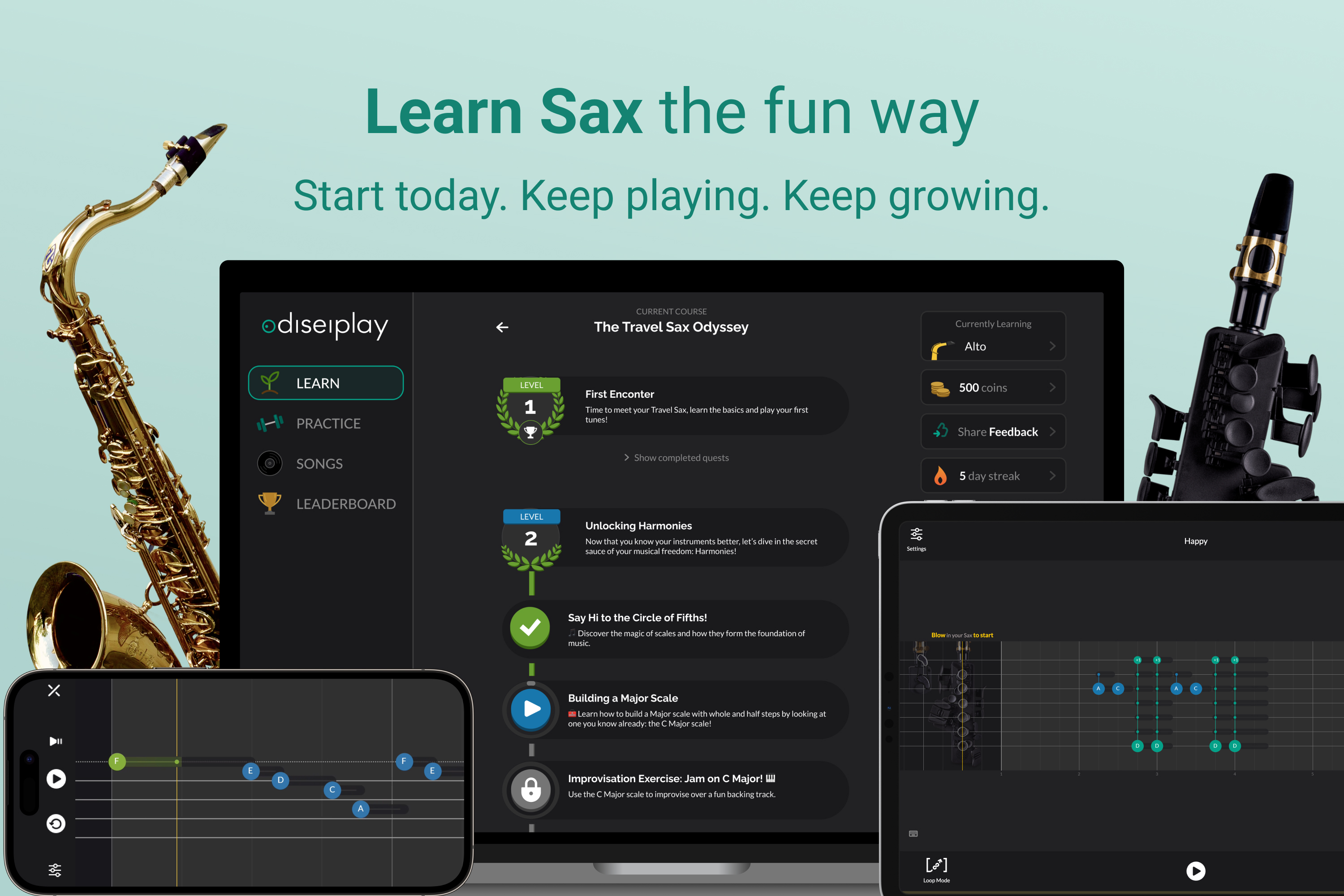 Odisei Play is a gamified learning app that makes saxophone practice feel like play. It guides absolute beginners and advanced players alike through four pillars: