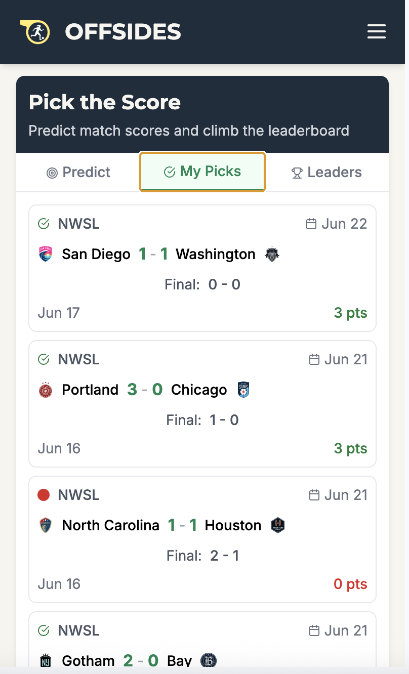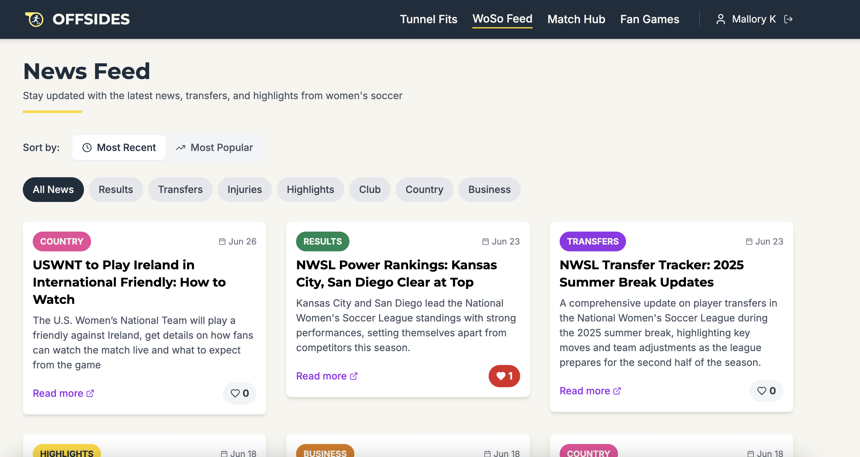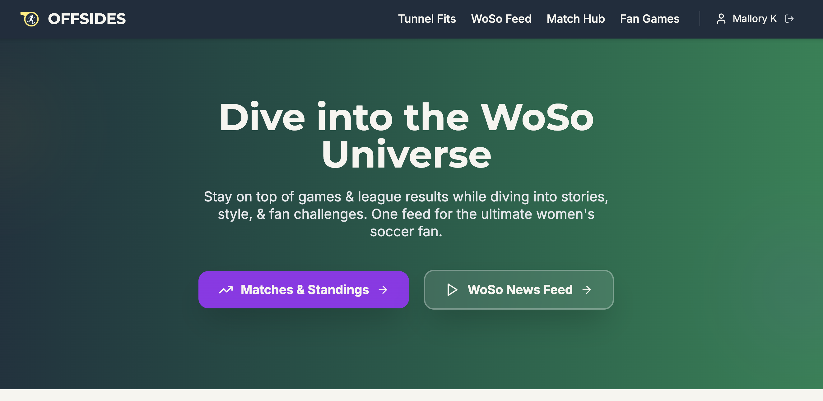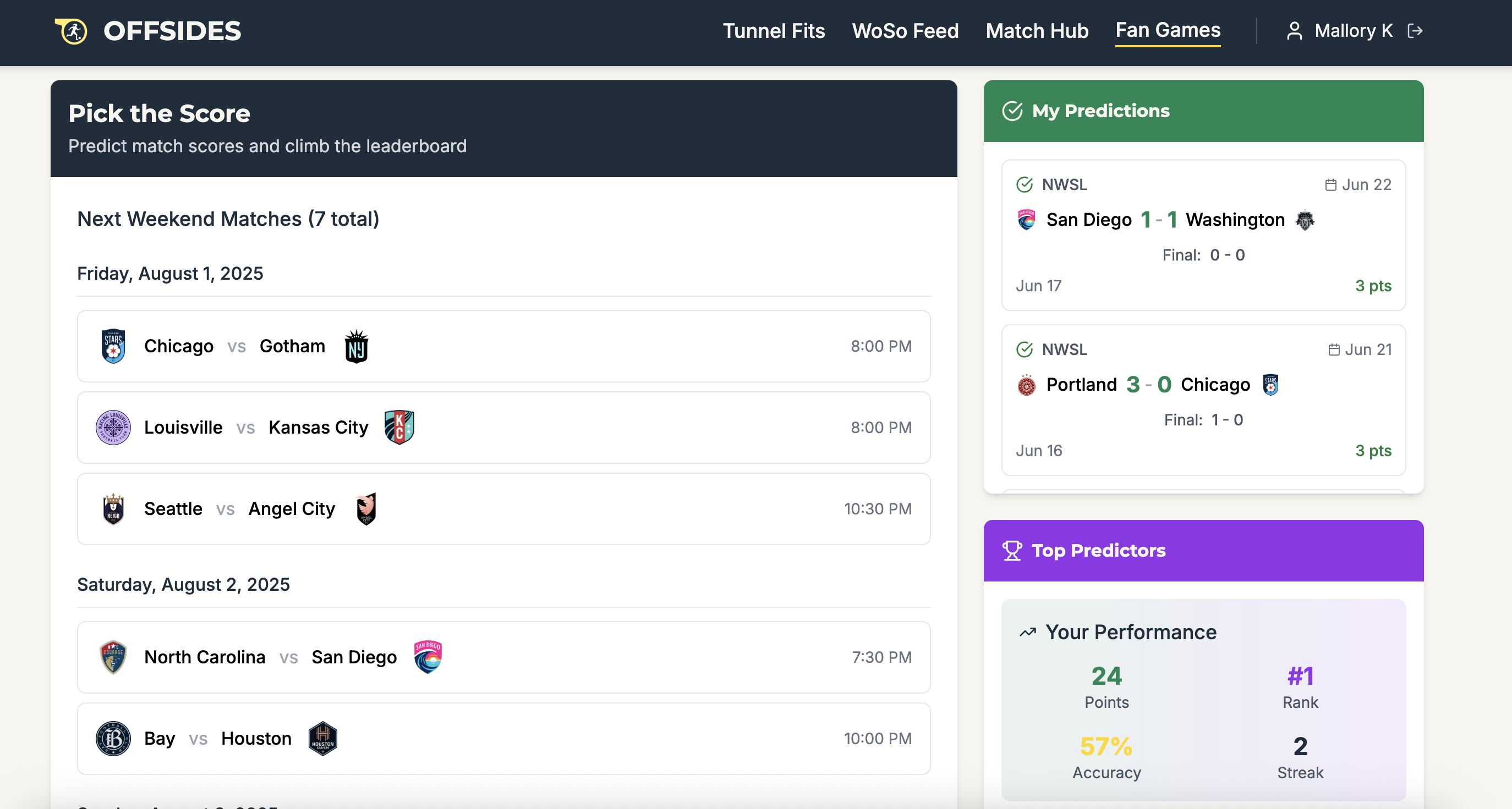Since May 30, I’ve been building offsideszone.com with a single objective: grow the women’s soccer fanbase. To achieve this, I created a one-stop shop that captures fans’ passion and interests. I’ve been inspired by the investment and drive the NWSL teams have brought in the last few years. The players, coaches, owners, and everyone who works for these teams bring so much energy, entertaining gameplay, and fun to the fanbase, and I wanted a spot to match that passion. From tunnel-fit photos and AI-curated news to upcoming match previews, live standings, and interactive pick-the-score games, my goal was to deliver a seamless, fan-first experience that empowers both new and die-hard supporters to discover, celebrate, and engage with the sport.