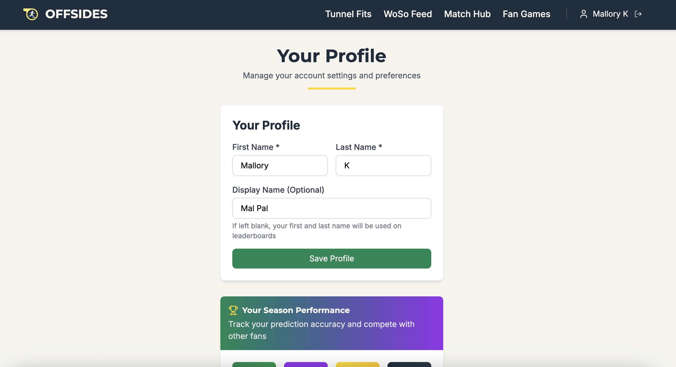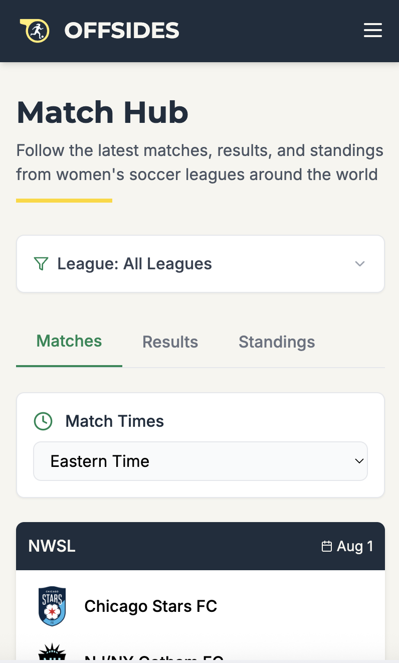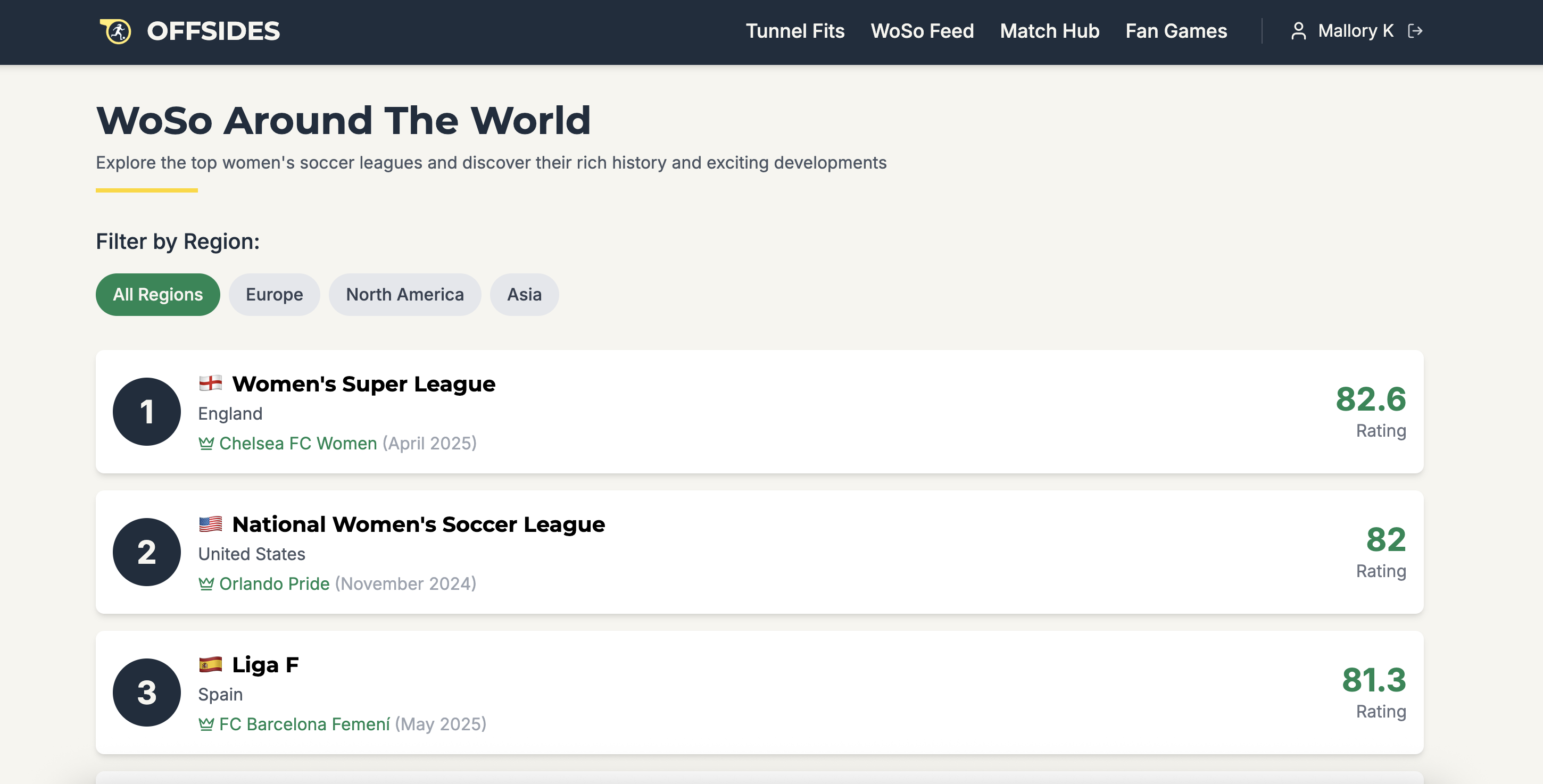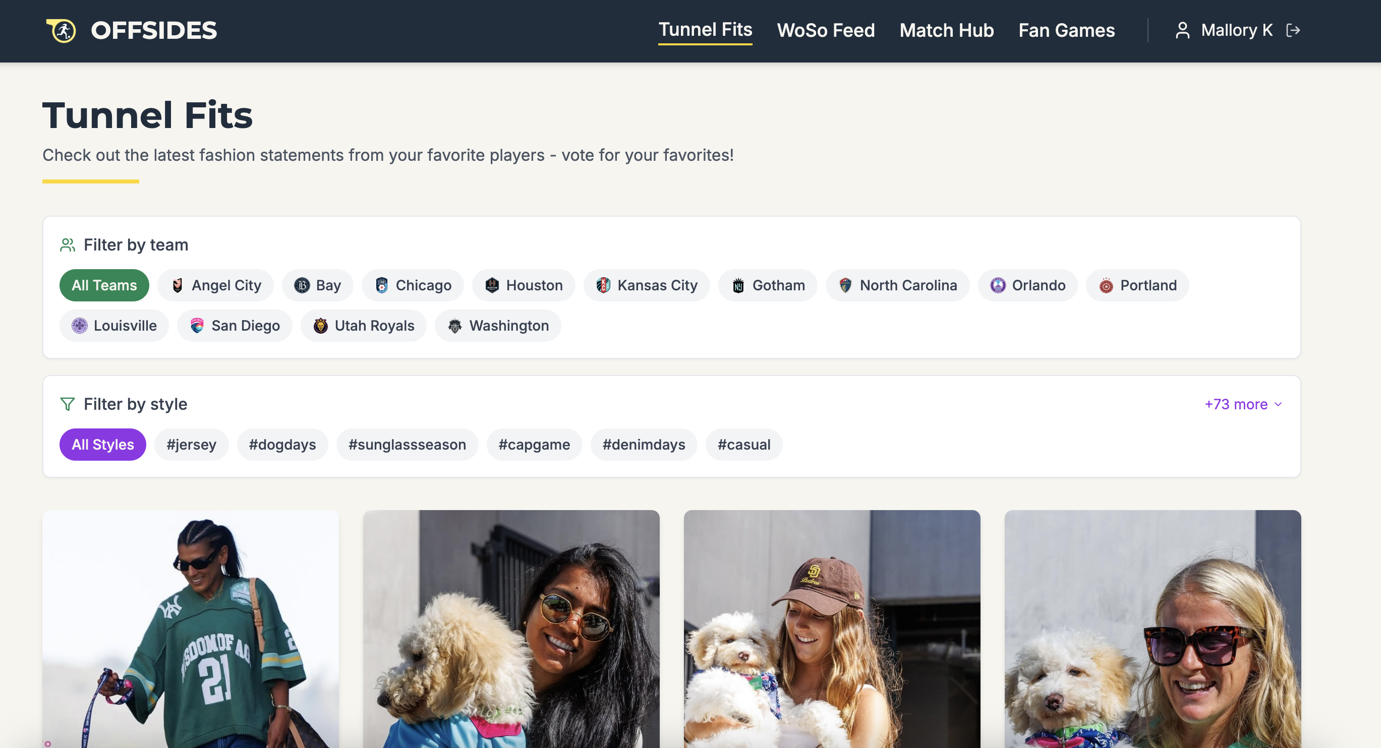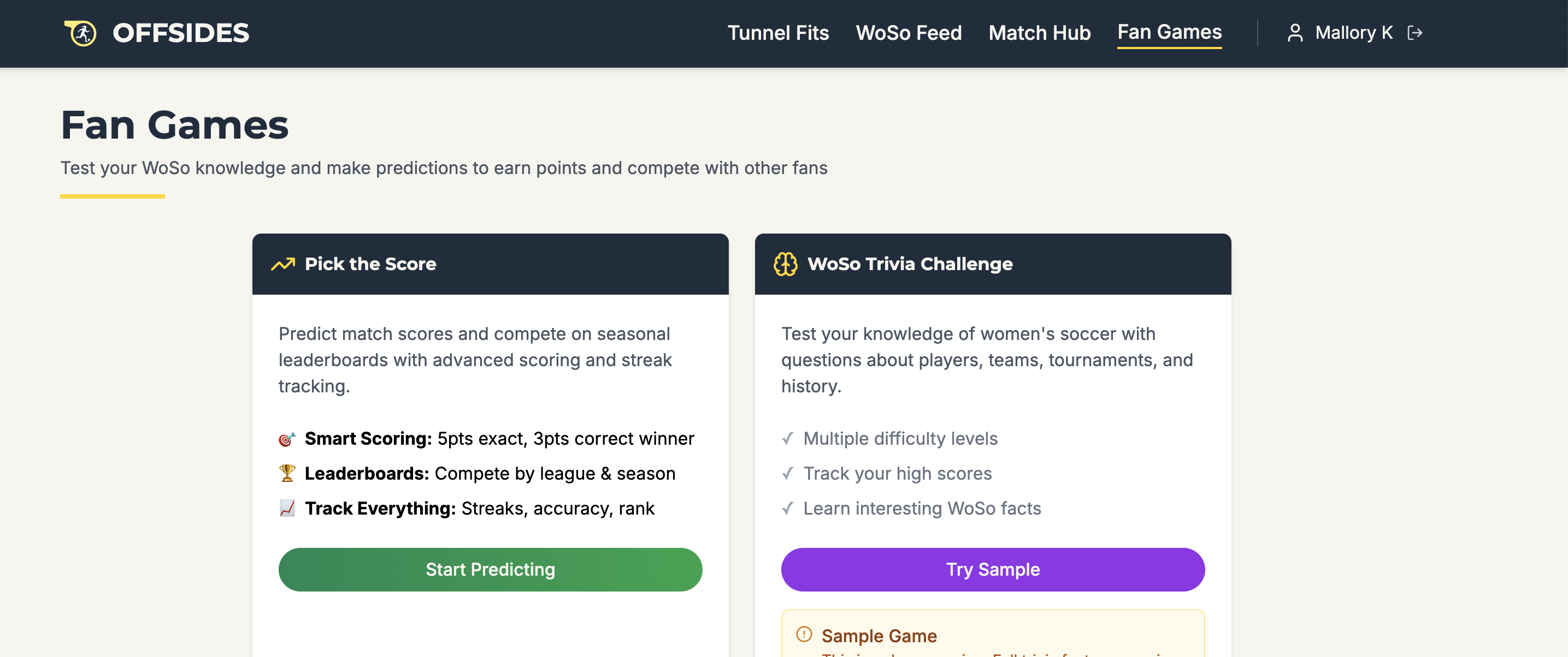 Since May 30, I’ve been building offsideszone.com with a single objective: grow the women’s soccer fanbase. To achieve this, I created a one-stop shop that captures fans’ passion and interests. I’ve been inspired by the investment and drive the NWSL teams have brought in the last few years. The players, coaches, owners, and everyone who works for these teams bring so much energy, entertaining gameplay, and fun to the fanbase, and I wanted a spot to match that passion. From tunnel-fit photos and AI-curated news to upcoming match previews, live standings, and interactive pick-the-score games, my goal was to deliver a seamless, fan-first experience that empowers both new and die-hard supporters to discover, celebrate, and engage with the sport.