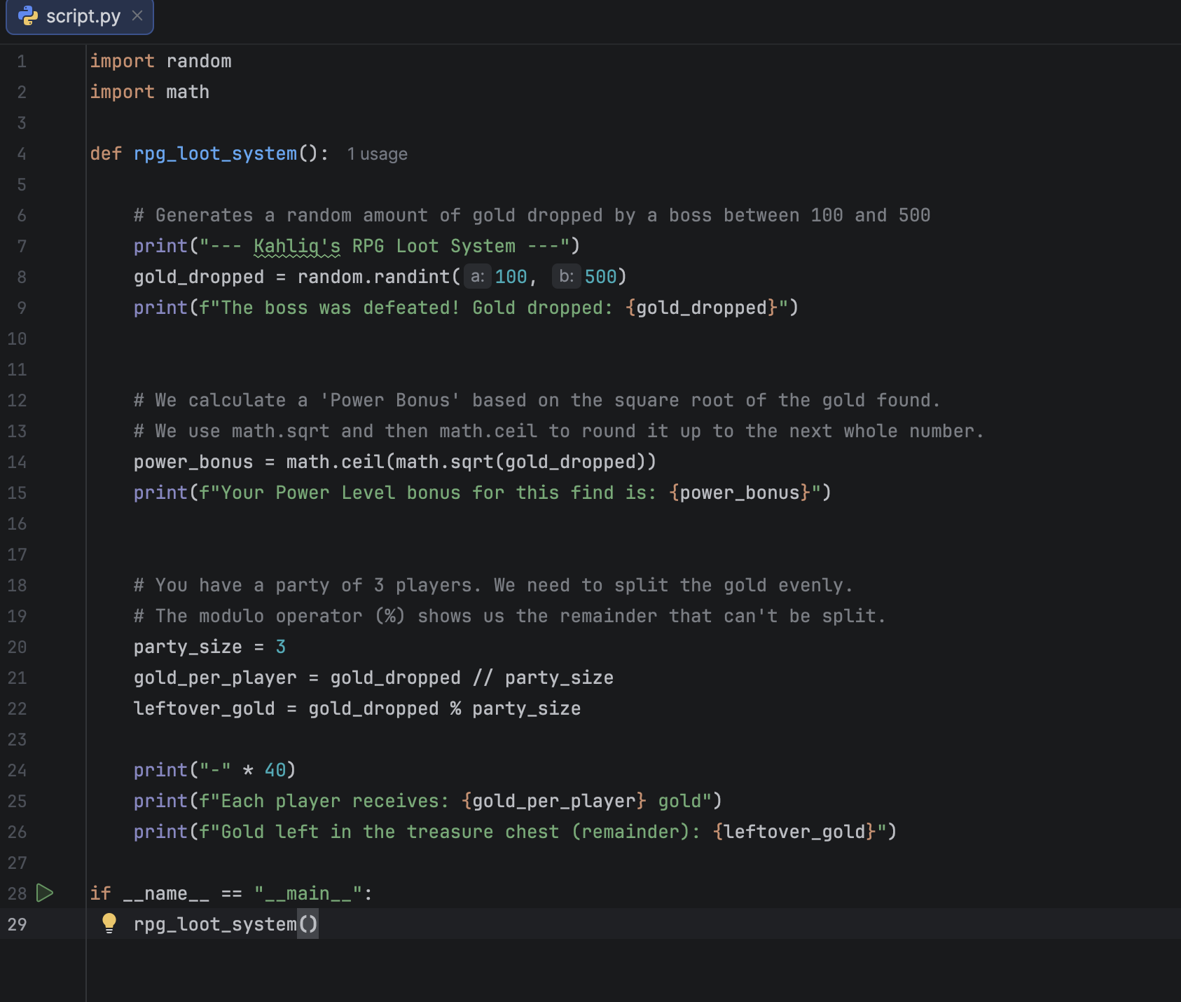 Development Journal: Improving Kahliq's RPG Loot System What Inspired Me The original RPG loot system sparked my interest because it mimicked a classic gaming scenario: defeating a boss, earning gold, and sharing rewards with a party. However, its flaw—leaving leftover gold in the chest—resonated with a common frustration in tabletop and video games. In many RPGs, players expect every single coin to be distributed fairly, even if it means some characters receive a minimal extra share. This inspired me to redesign the system to prioritize total loot distribution while maintaining clarity and fairness. I also drew motivation from game design principles that emphasize transparency (e.g., showing exact splits) and player trust. What I Learned Integer Division vs. Real-World Fairness The original code used // (integer division) and % (modulo) correctly to calculate base shares and remainders. But I learned that in collaborative games, fairness isn’t just mathematical—it’s perceptual. Leaving remainder gold unassigned feels unfair, even if logically “even.” Distributing the remainder to the first few players (instead of discarding it) creates a more satisfying experience. The Power of math.ceil and math.sqrt Calculating the “Power Bonus” using math.sqrt() taught me how mathematical functions can add depth to game mechanics. For example: math.sqrt(100) gives 10, but math.ceil(math.sqrt(101)) rounds up to 11, ensuring bonuses scale meaningfully even for small gold increments. User Experience (UX) in Terminal Outputs I realized that raw data (e.g., “leftover_gold = 1”) isn’t engaging for players. Using emojis, section headers, and step-by-step breakdowns makes the system feel like a polished game feature—not just code. Loop-Based Distribution Logic Building the player-by-player breakdown with a for loop taught me how to handle dynamic distributions programmatically. For example, checking if i < remainder to award extra coins simplified what could have been messy conditional statements. How I Built the Project Step 1: Diagnose the Original Problem I started by analyzing the original code: Gold generation (random.randint(100, 500)) was perfect. Power bonus calculation was correct but lacked flair. Distribution failed because it reported leftover gold as “remaining in the chest,” violating RPG norms. My goal: Distribute 100% of the loot. Step 2: Design the Distribution Algorithm I drafted a plan: Calculate base_gold = total_gold // party_size. Calculate remainder = total_gold % party_size. Distribute the remainder: Give 1 extra coin to the first remainder players. For example, with 155 gold and 3 players: Base = 51, Remainder = 2 Player 1: 52, Player 2: 52, Player 3: 51 Step 3: Enhance Output Clarity I structured the output into logical sections: Loot Summary (gold dropped + power bonus). Distribution Overview (base share, remainder explanation). Player Breakdown (loop to show individual rewards). To make it immersive, I added emojis (🎯, 💪, ⚠️) and separators (=== ... ===). Step 4: Code Implementation