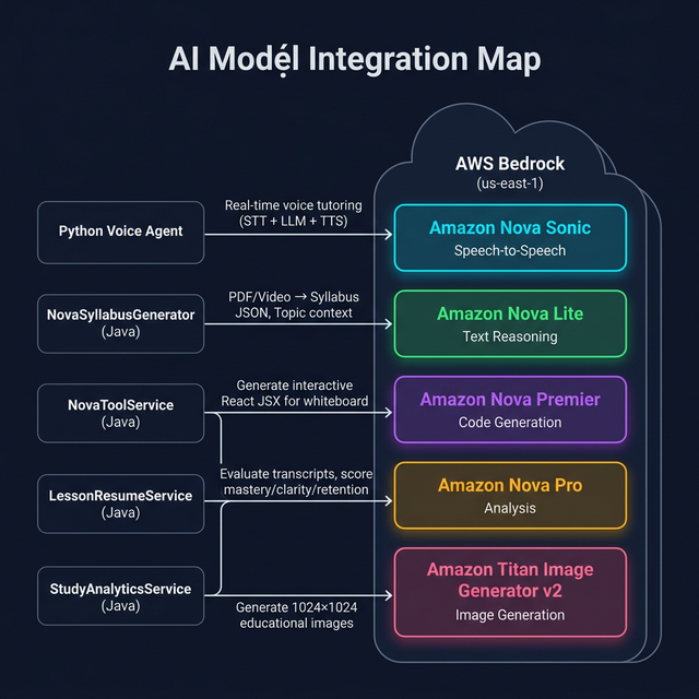 - End-to-end AI pipeline five different Amazon Nova models working in harmony: Sonic for voice, Lite for syllabus generation, Premier for code visualization, Pro for evaluation, and Titan for image generation