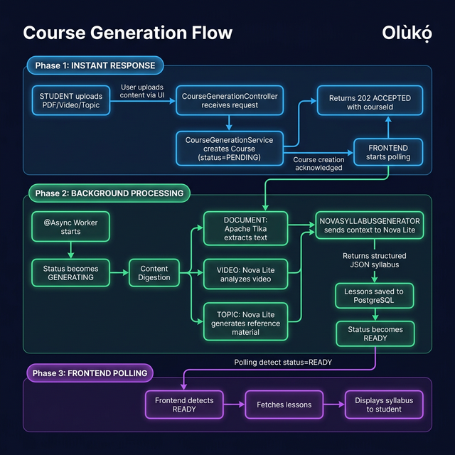 - Async architecture that scales course generation runs on background threads with frontend polling, keeping the API responsive even during heavy AI processing